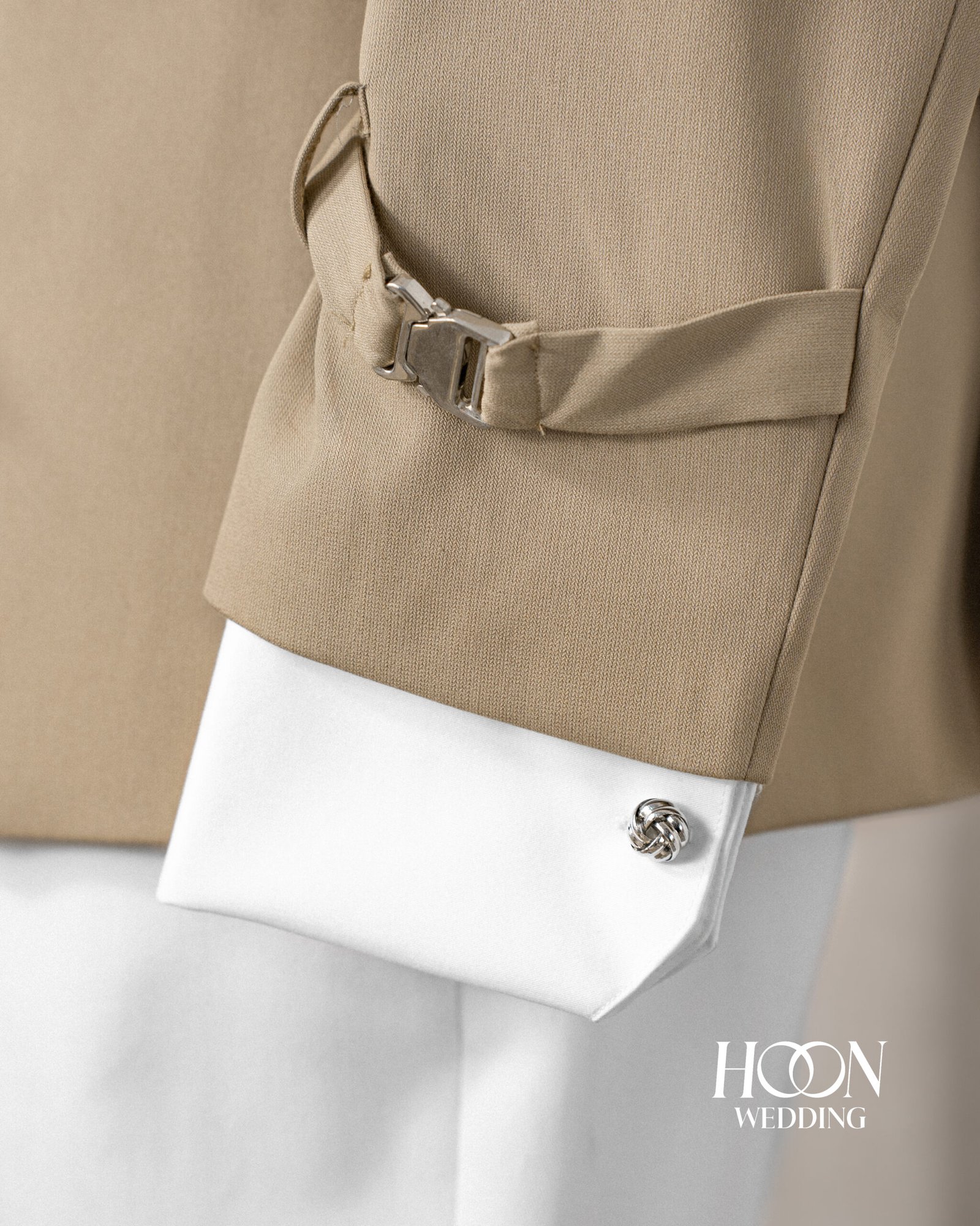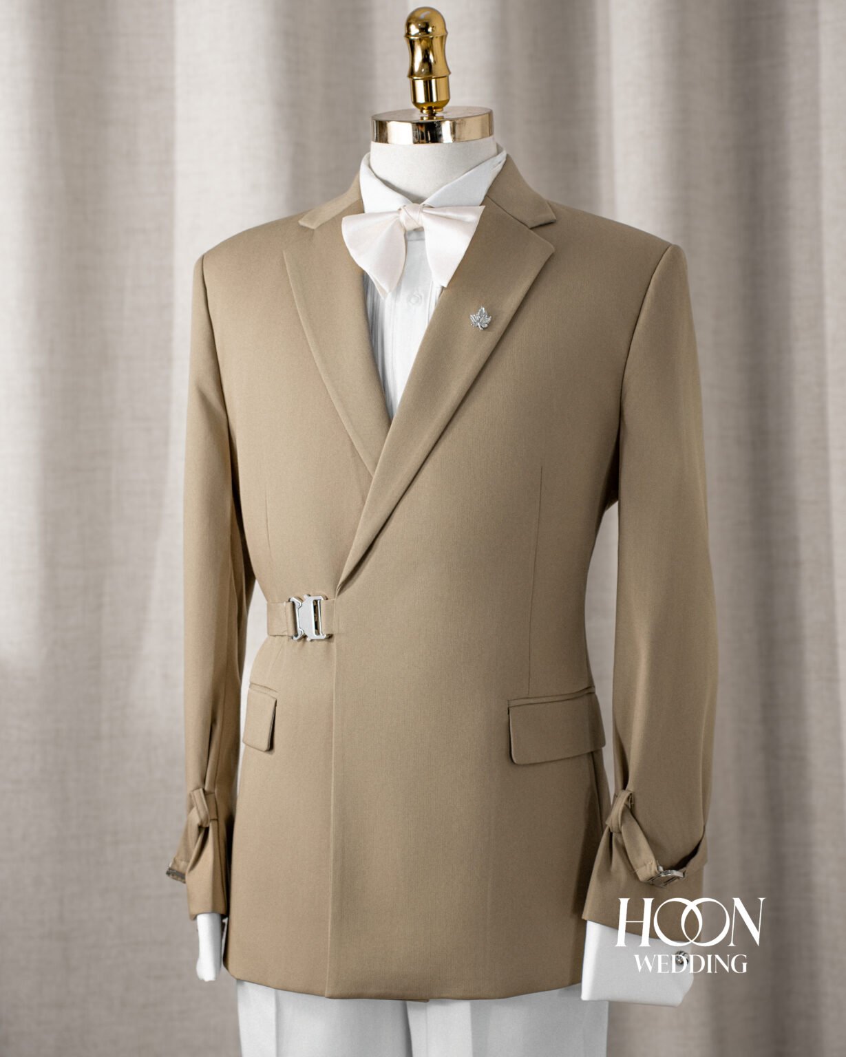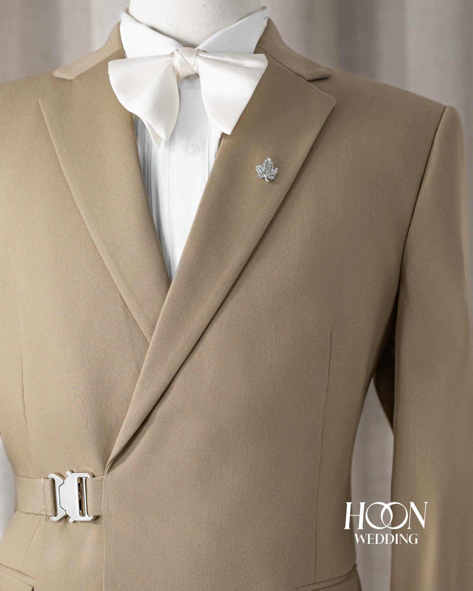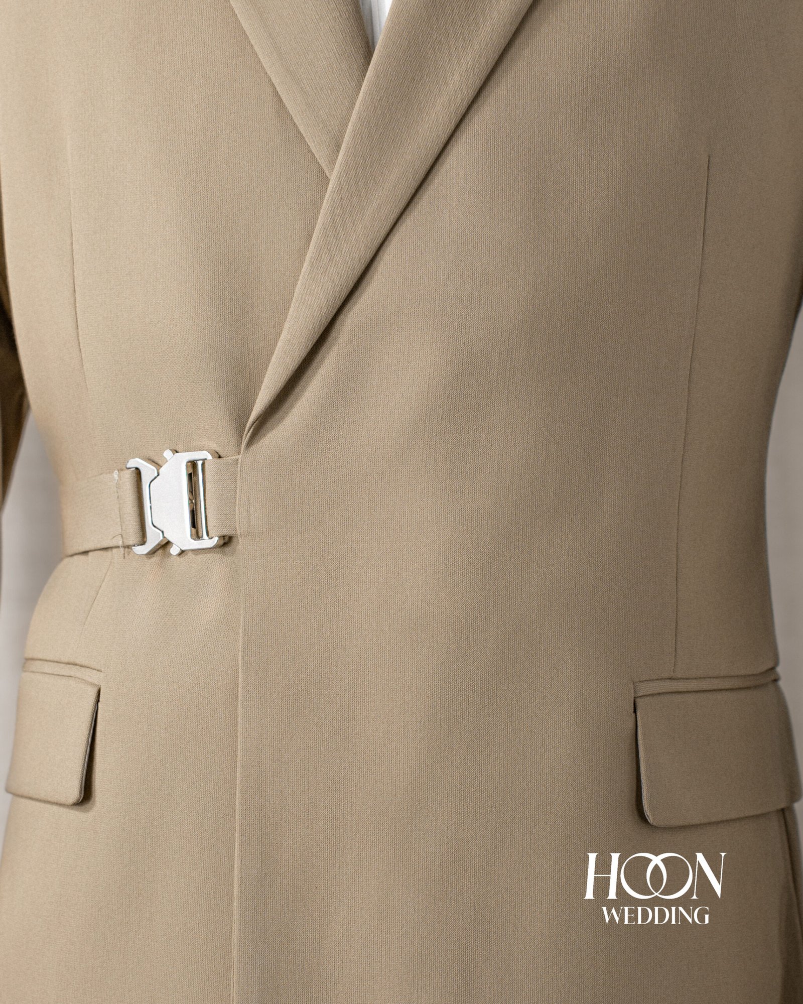 Suit màu beige khóa eo hiện đại, thiết kế tối giản thanh lịch – lựa chọn hoàn hảo cho chú rể phong cách tại Hoon Weddings.
