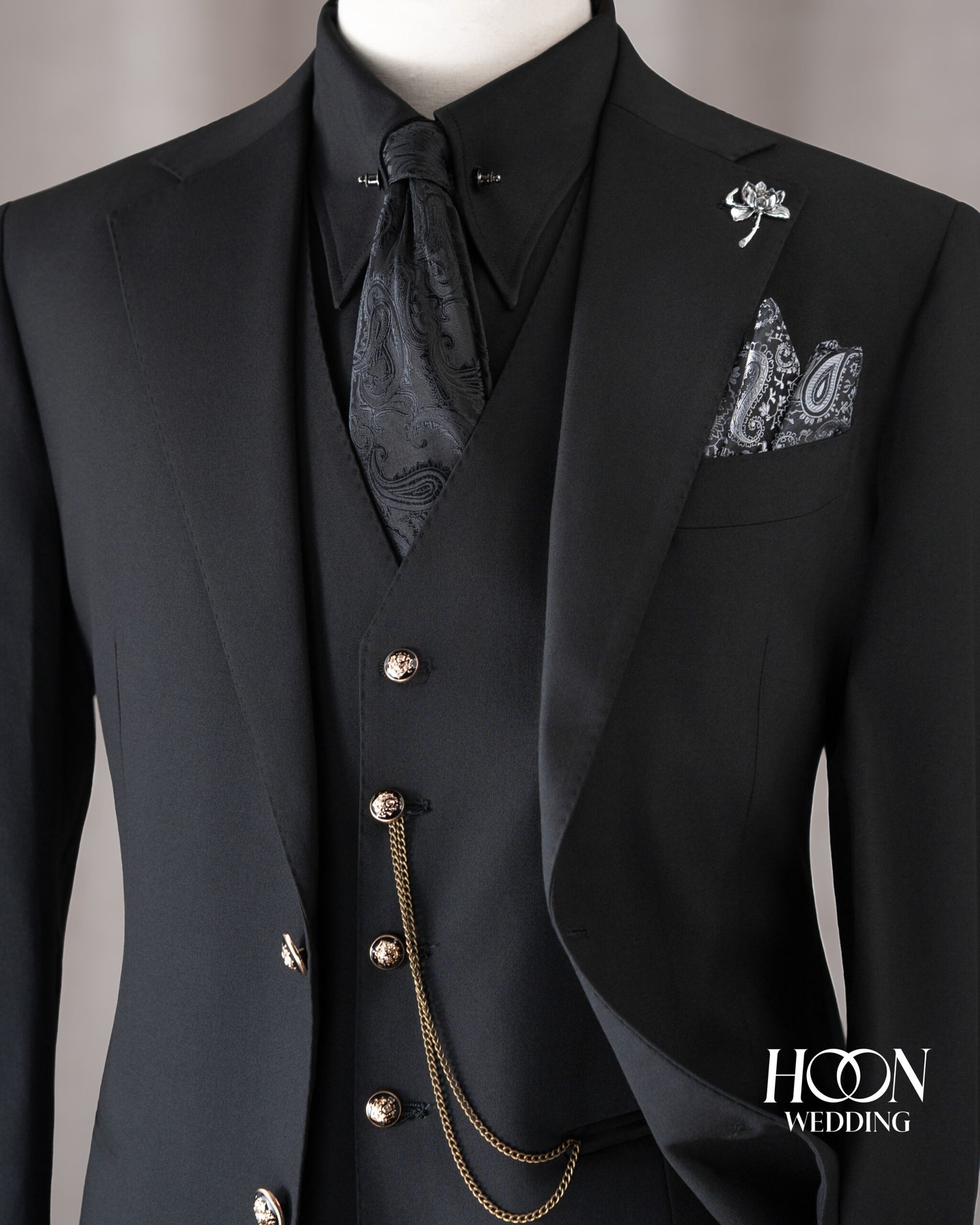 Signature Suit Black Draped Three-Piece. Suit 3 mảnh đen tuyền, áo vest dáng dài lịch lãm. Phong cách cổ điển, quyền lực, hoàn hảo cho chú rể yêu thích sự trang trọng tuyệt đối.