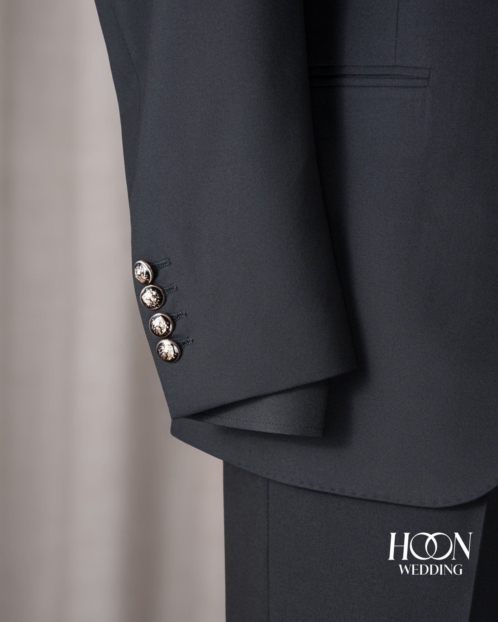 Chi Tiết Nổi Bật: Khuy áo vest và gile màu vàng đồng/vàng nhạt, tạo điểm nhấn quý phái trên nền đen.