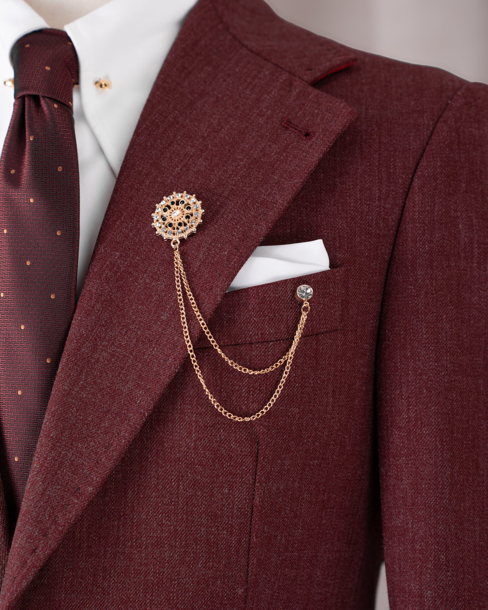 • Phụ kiện brooch vàng đồng sang trọng, nổi bật trên nền vải.