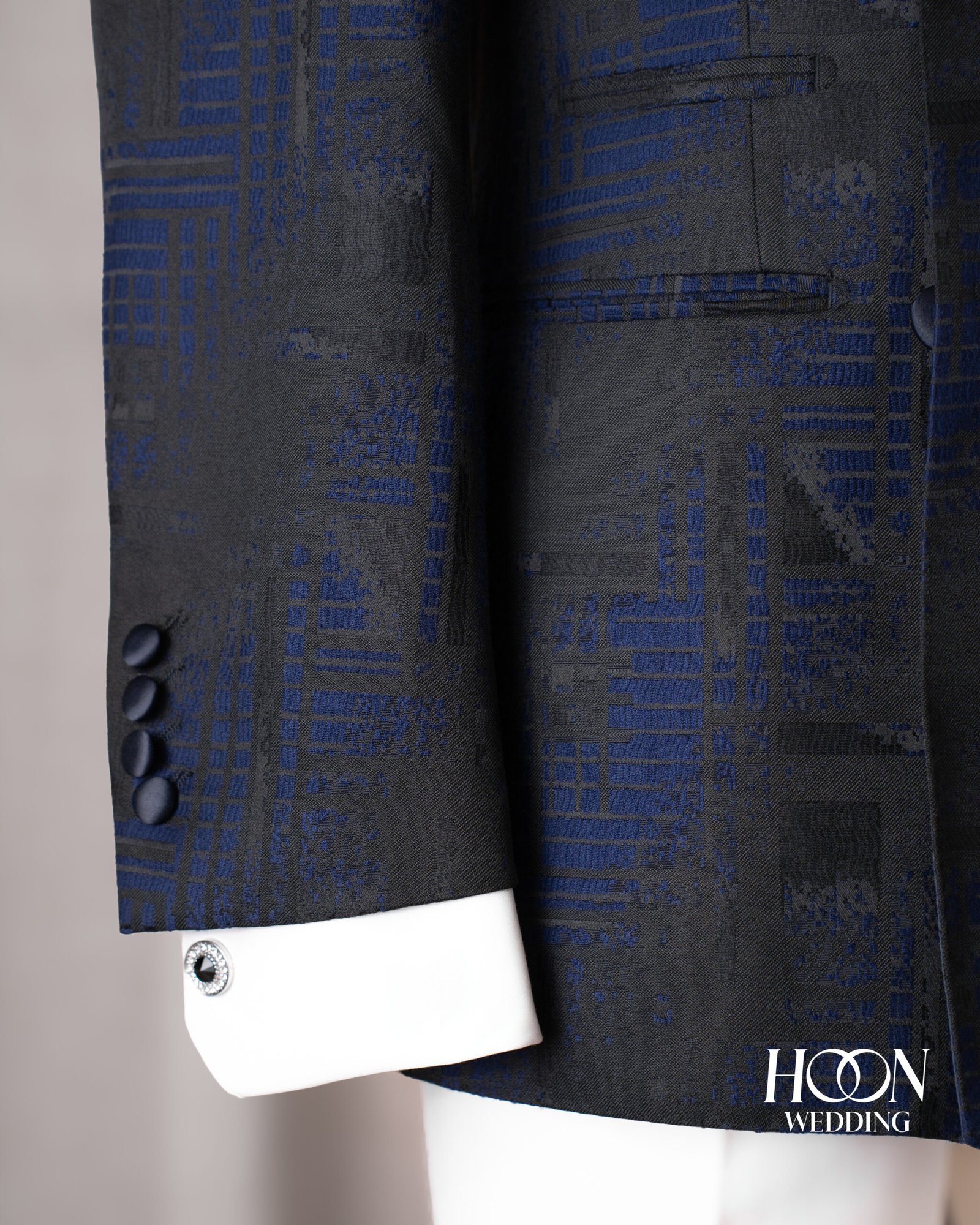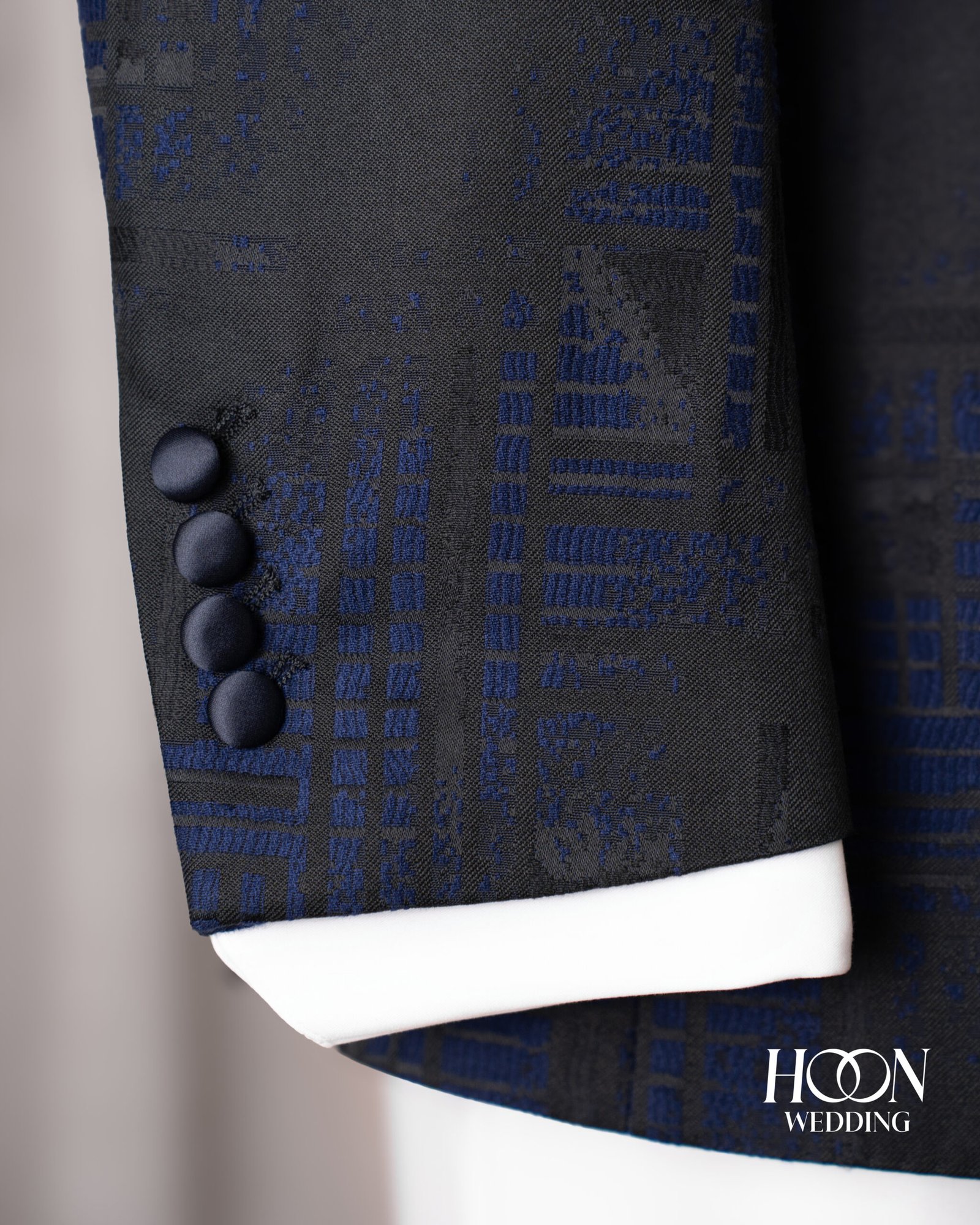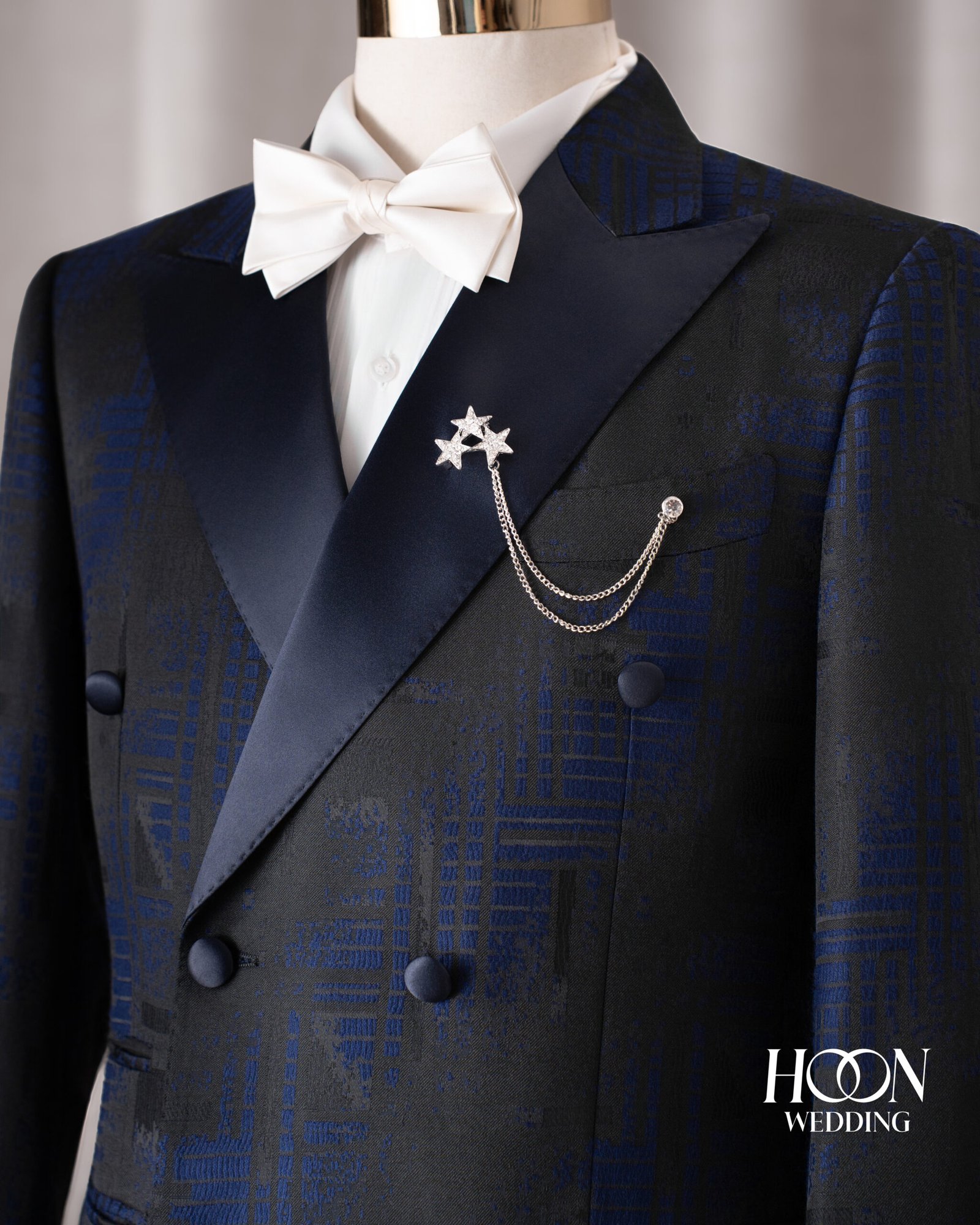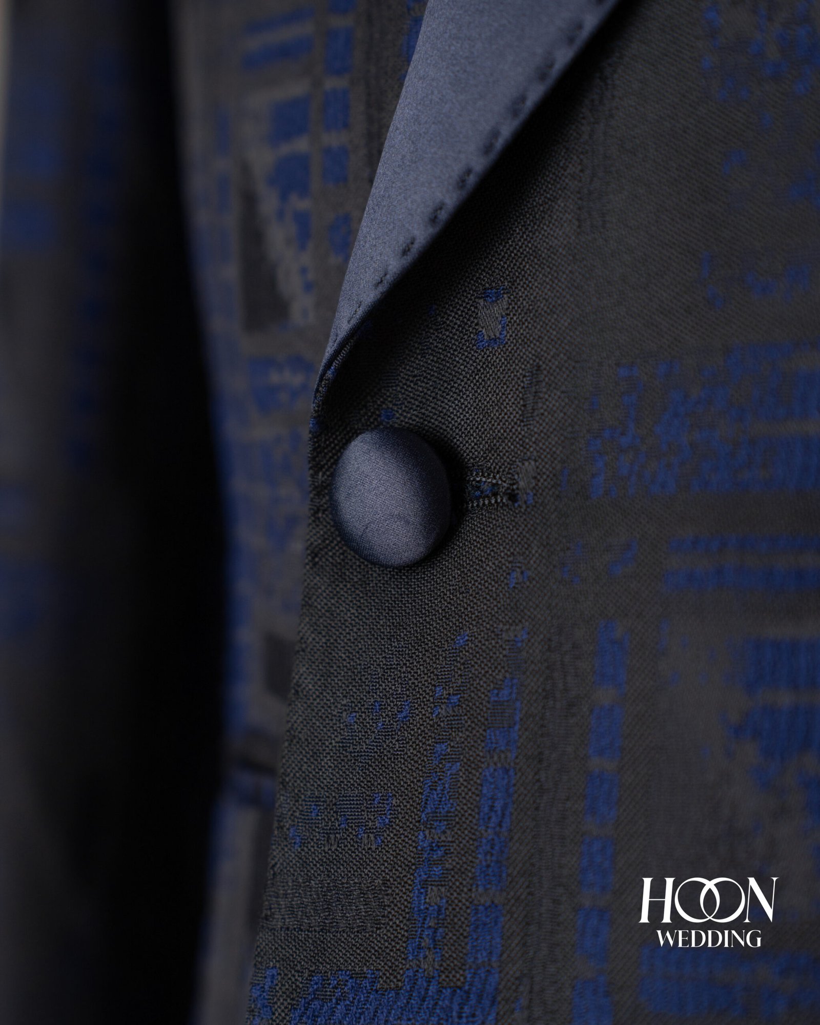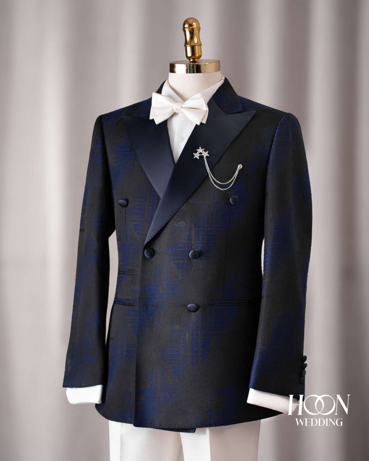 Capri Midnight Blue Suit – thiết kế double-breasted sang trọng với sắc xanh đen huyền bí và họa tiết jacquard độc đáo, tôn lên vẻ lịch lãm tinh tế của quý ông.
