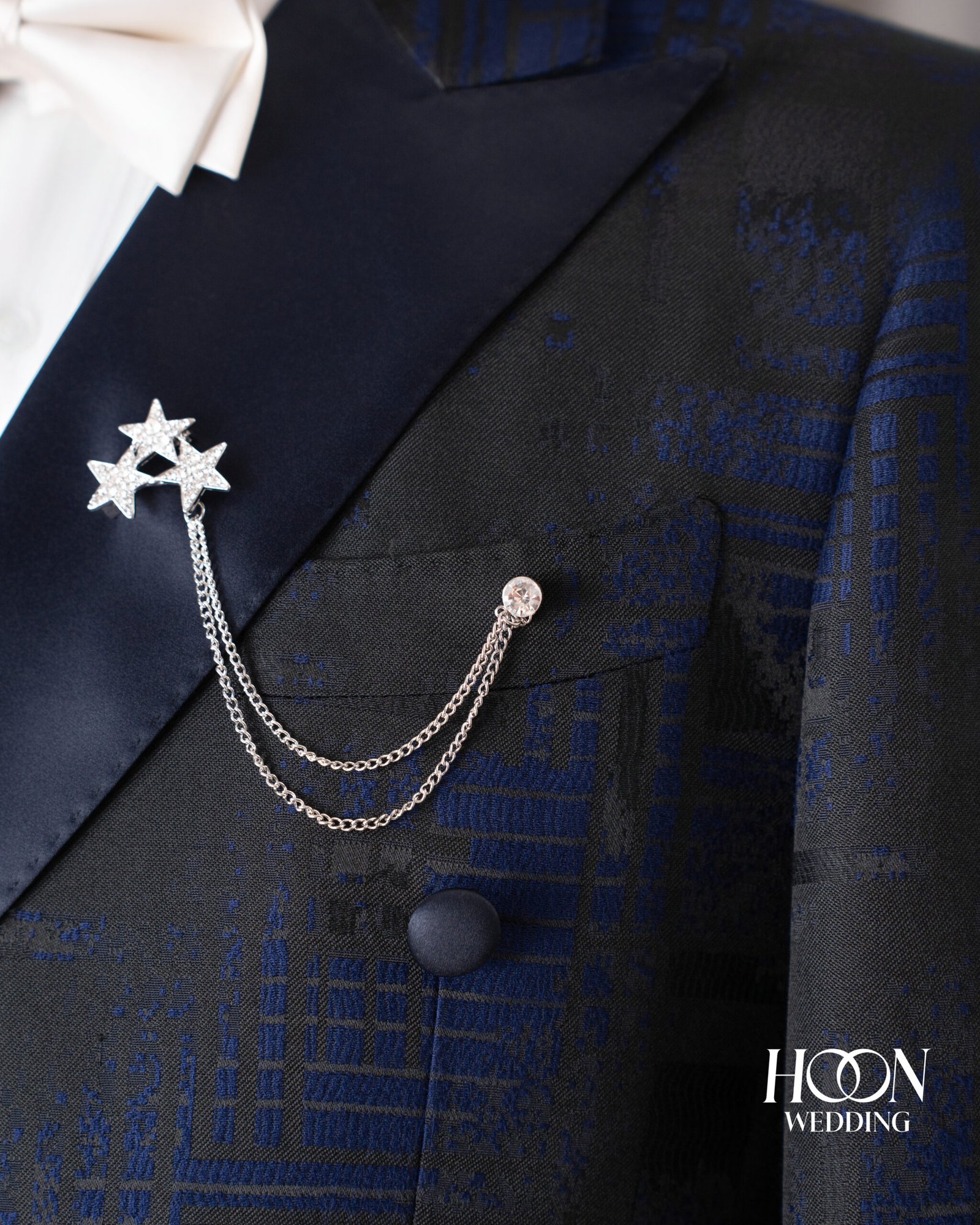 • Ve nhọn bản trung, phối vải satin ánh navy nổi bật.