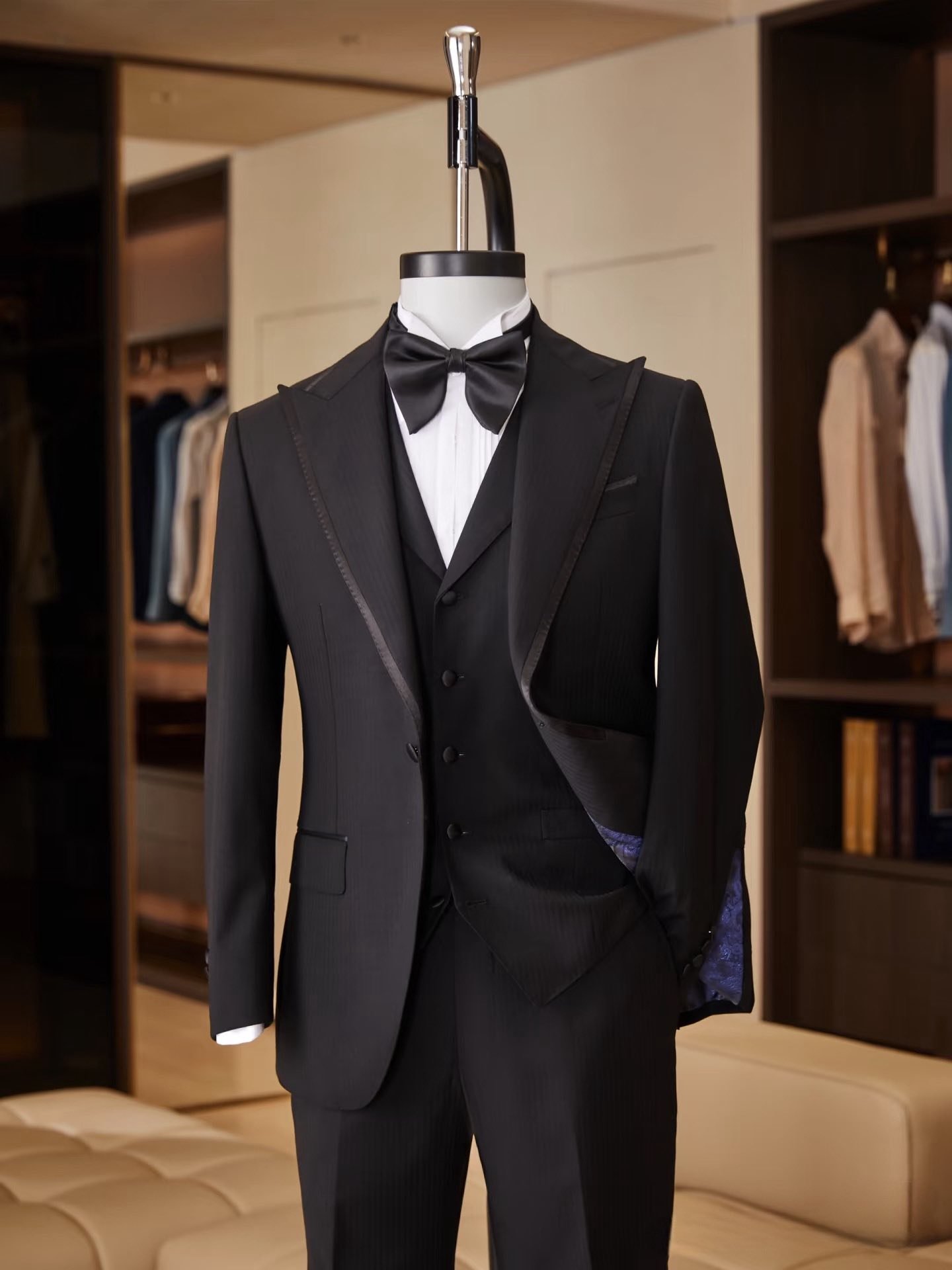 Capri Midnight Tuxedo – Bộ tuxedo đen cổ điển với ve satin sang trọng, phom dáng chuẩn mực và chất liệu cao cấp, lý tưởng cho mọi sự kiện trang trọng.