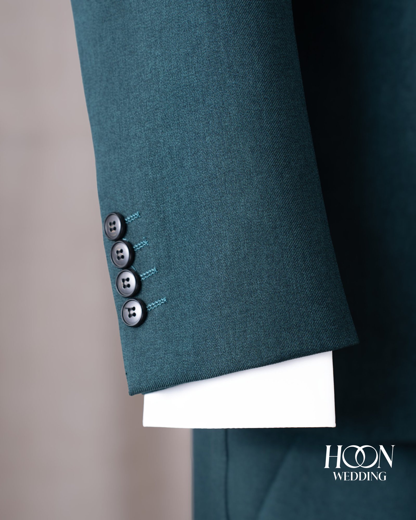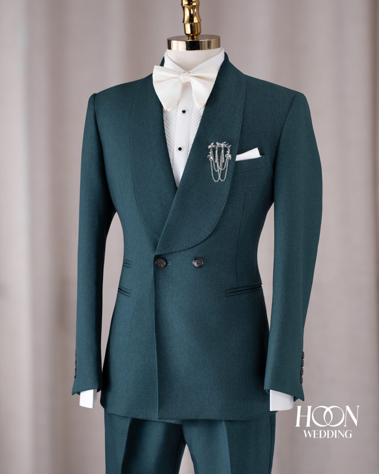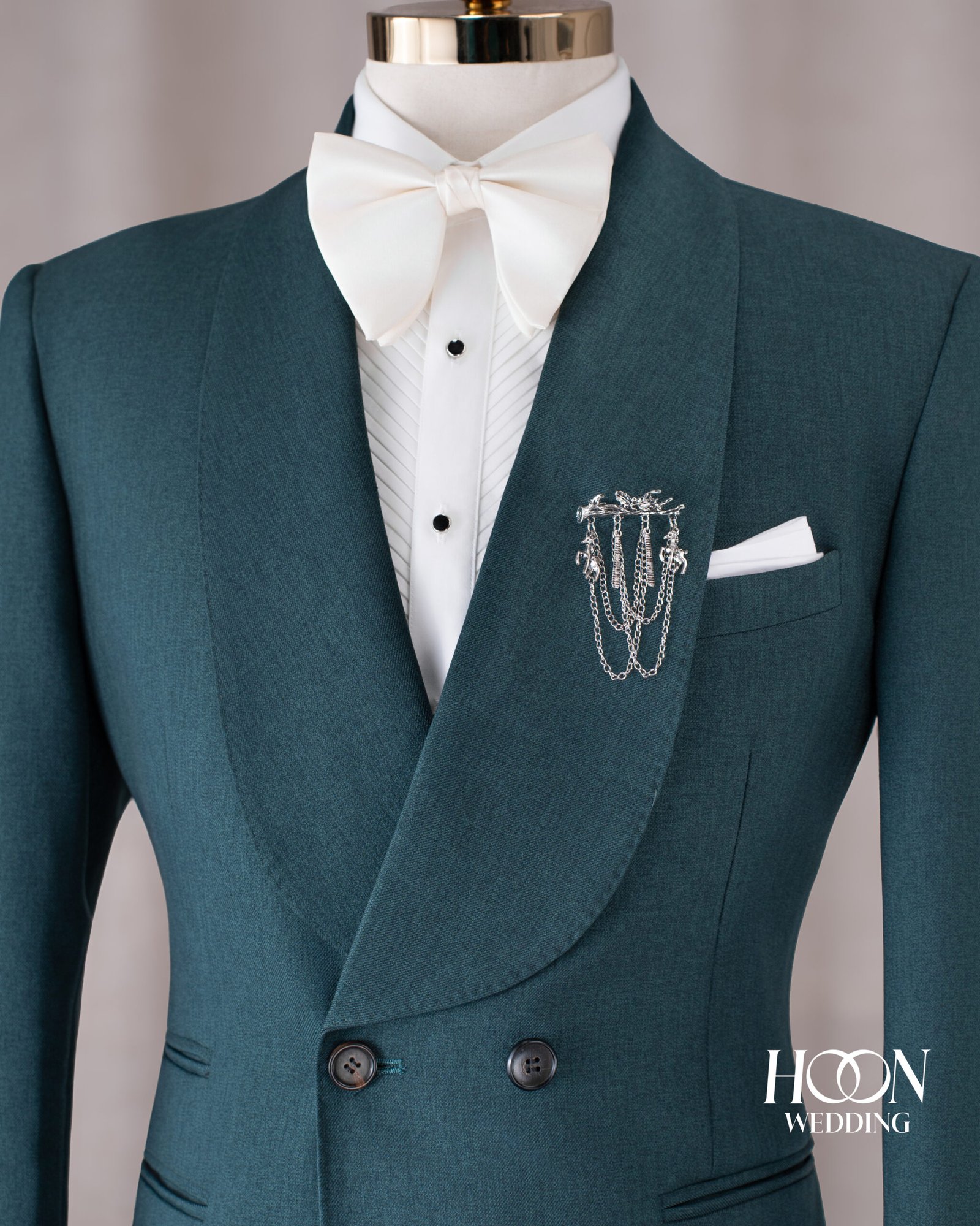 Elegant Suit Emerald Green Double-Breasted. Suit hai hàng khuy màu xanh ngọc lục bảo độc đáo, ve áo tròn lịch lãm. Lựa chọn đẳng cấp cho chú rể phá cách, cuốn hút trong tiệc tối.