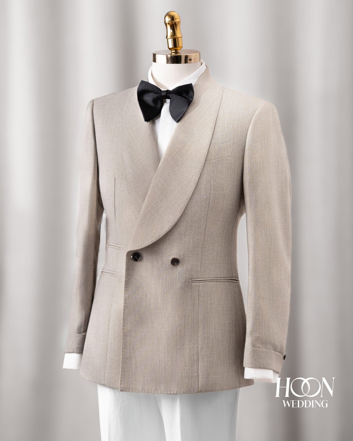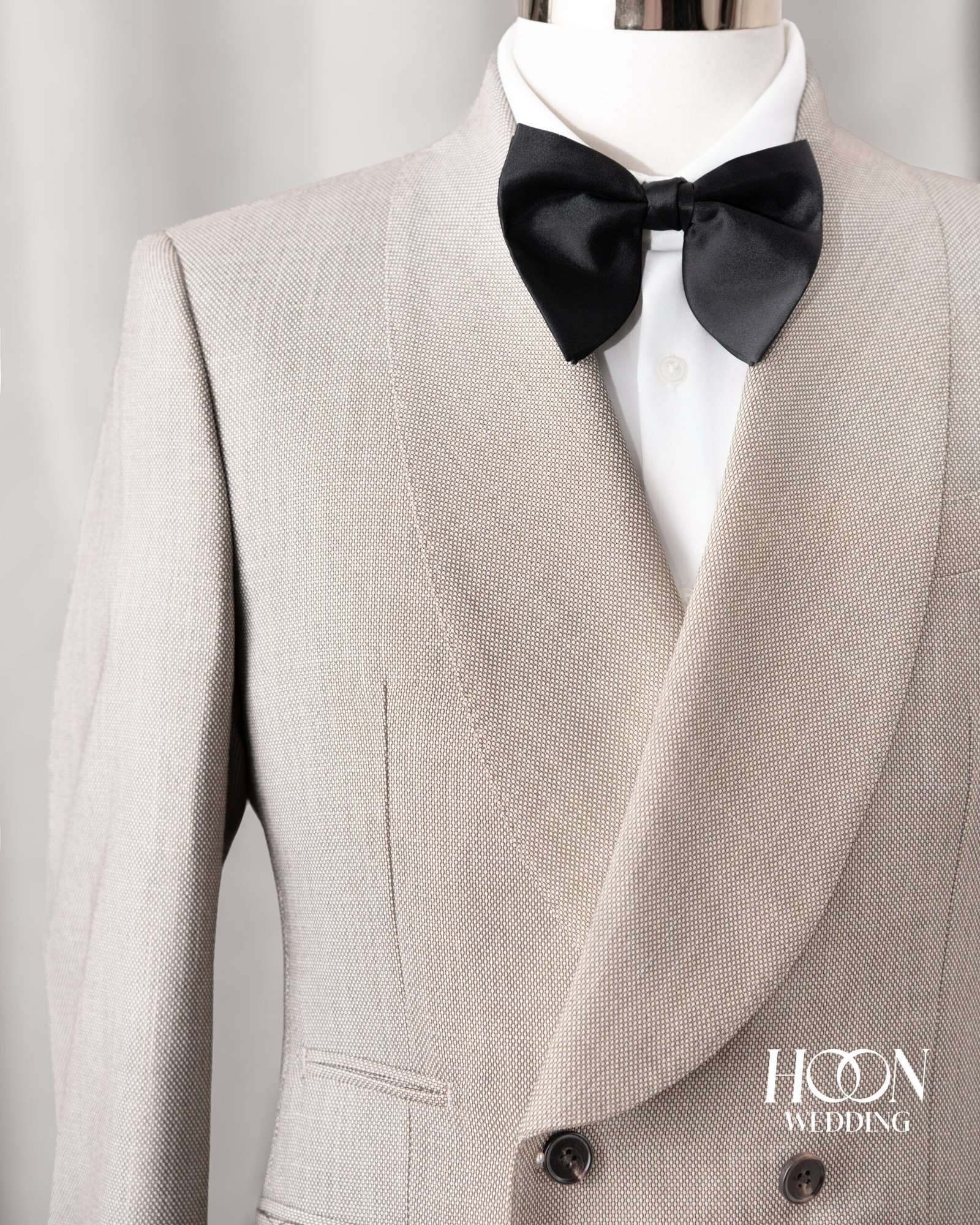 Thiết kế double-breasted cổ ve sam (peak lapel) – biểu tượng của sự quyền lực và tinh tế.