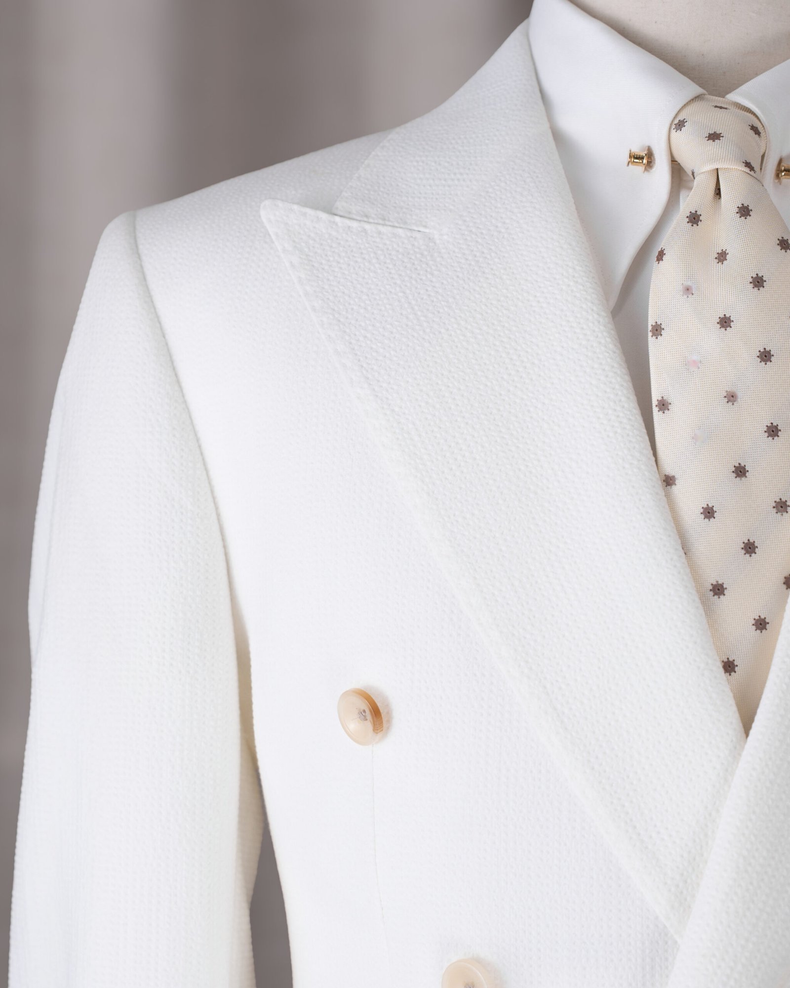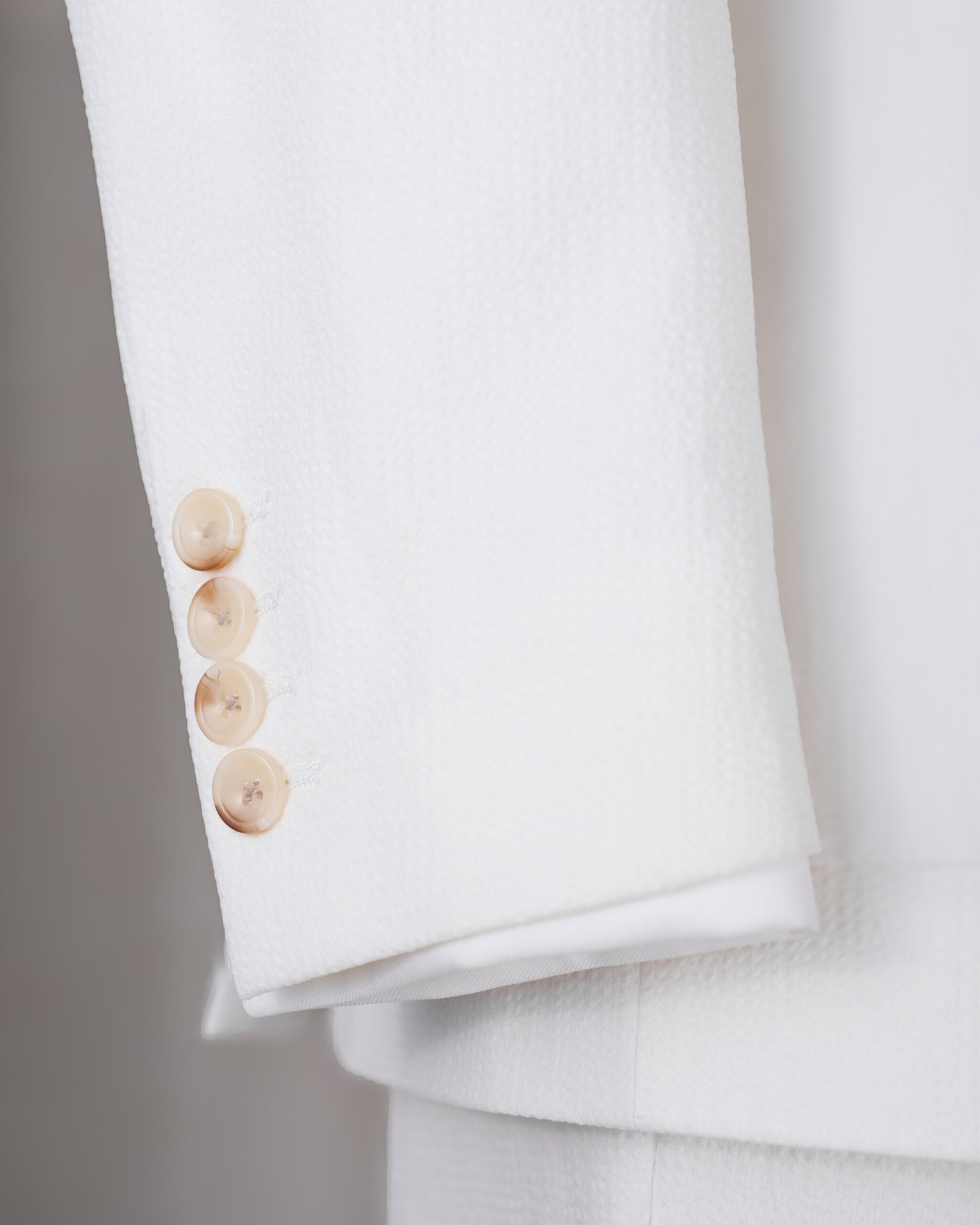 • Ivory Seersucker Regent Suit – Chất liệu seersucker trắng cao cấp, bề mặt gợn nhẹ tạo hiệu ứng thanh lịch và thoáng khí.