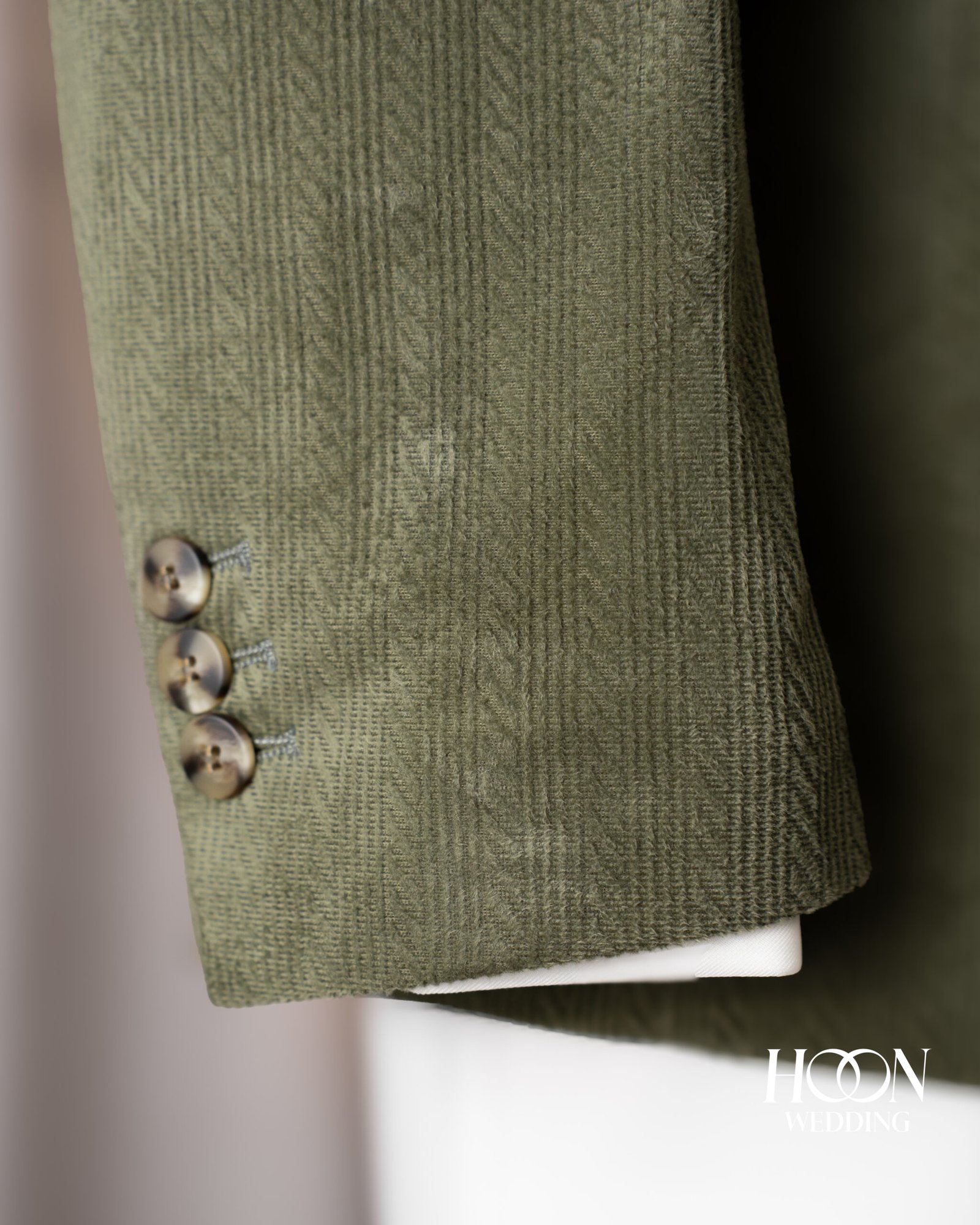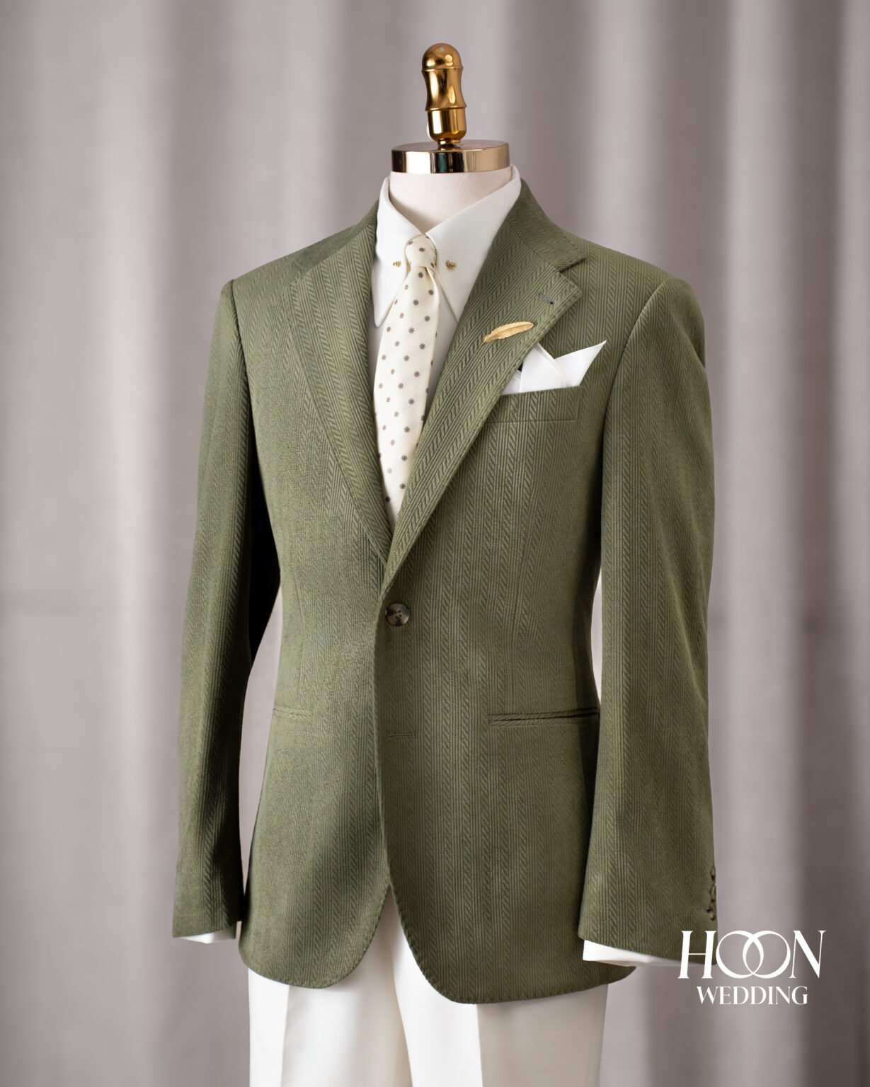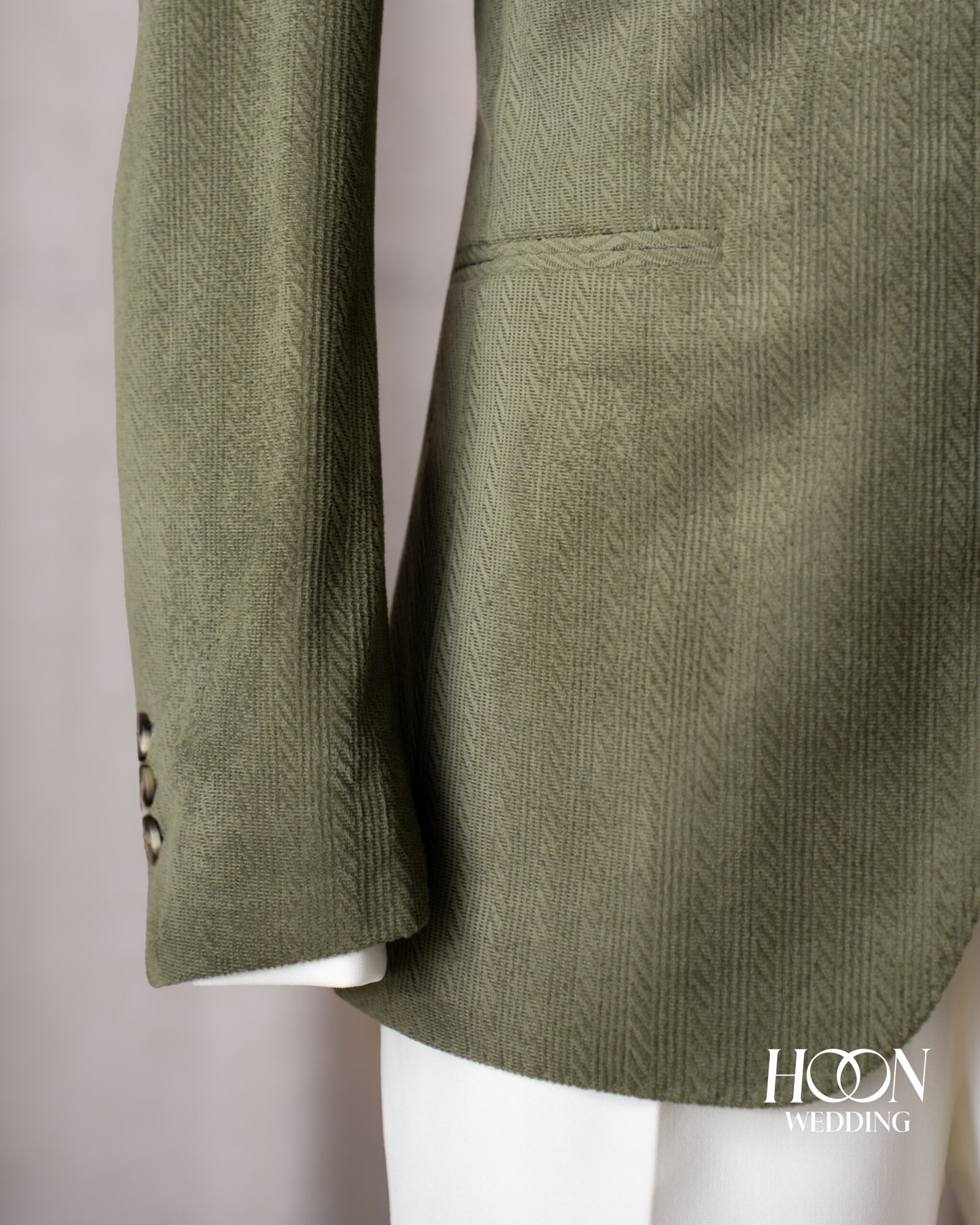 Lugano Olive Suit – bộ suit xanh olive thanh lịch với họa tiết vân xương cá sang trọng, mang phong thái tự tin và tinh tế của quý ông hiện đại.
