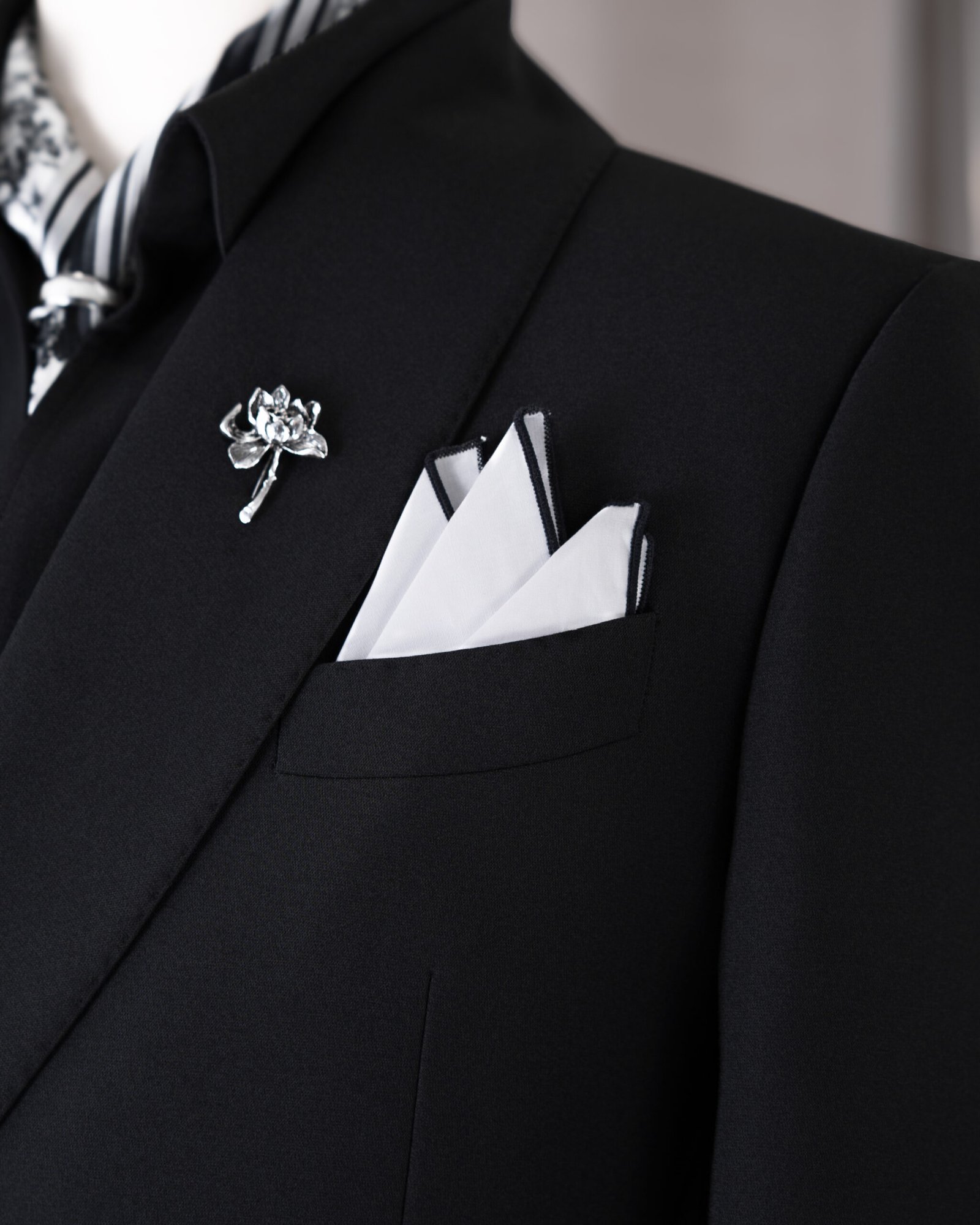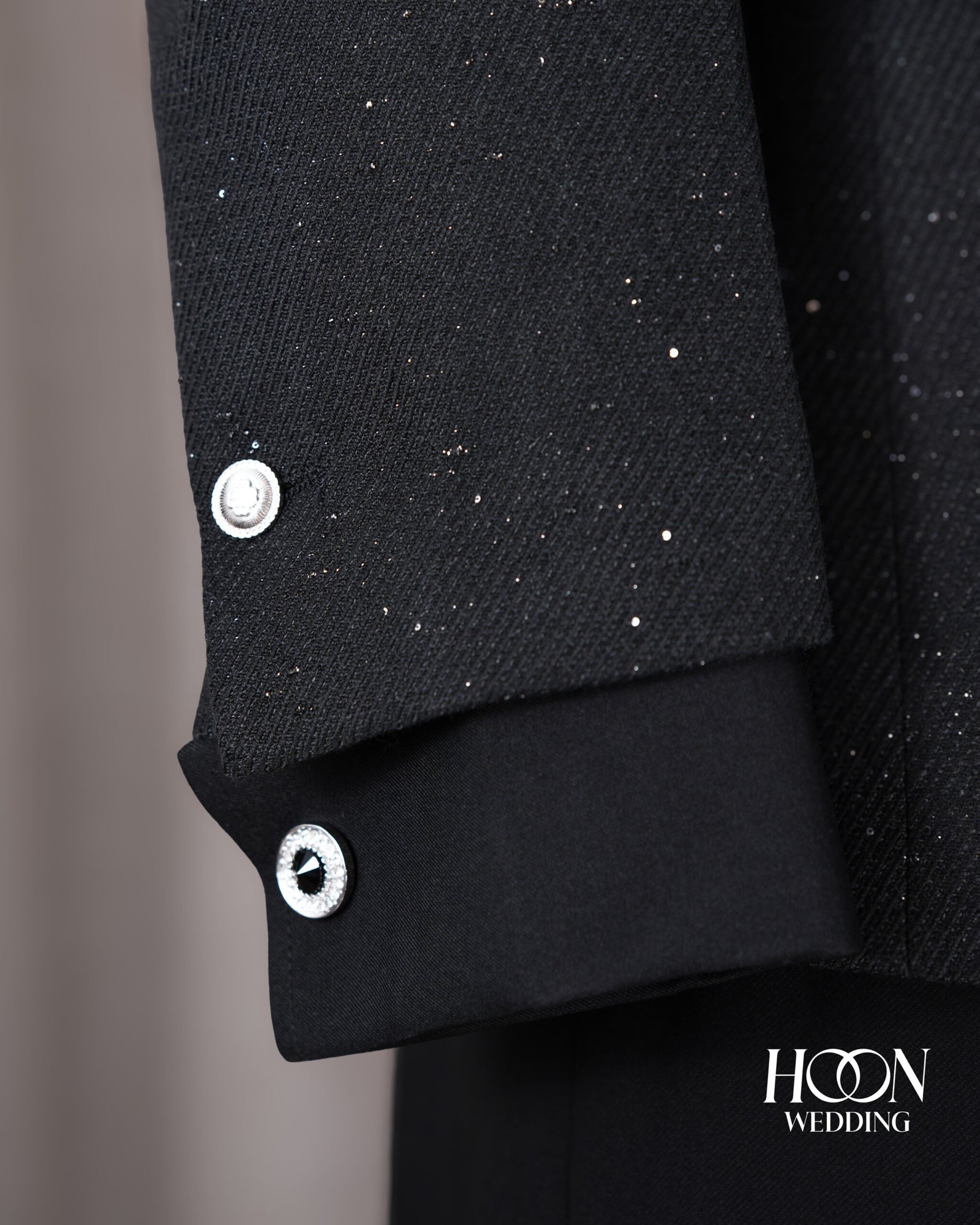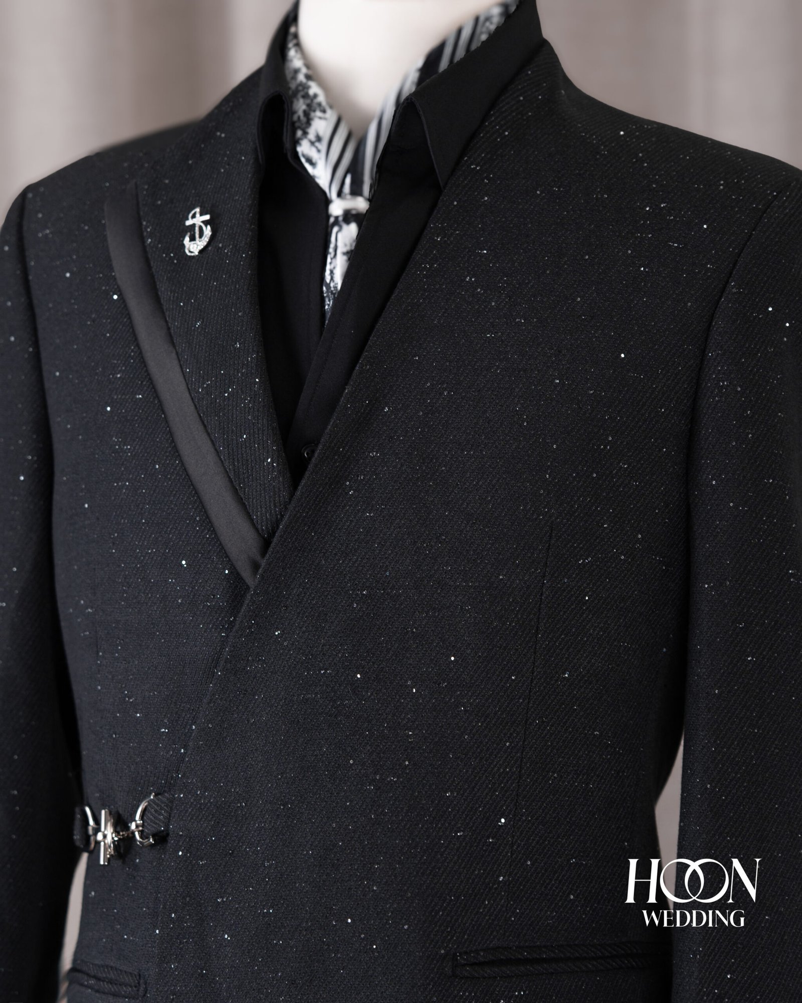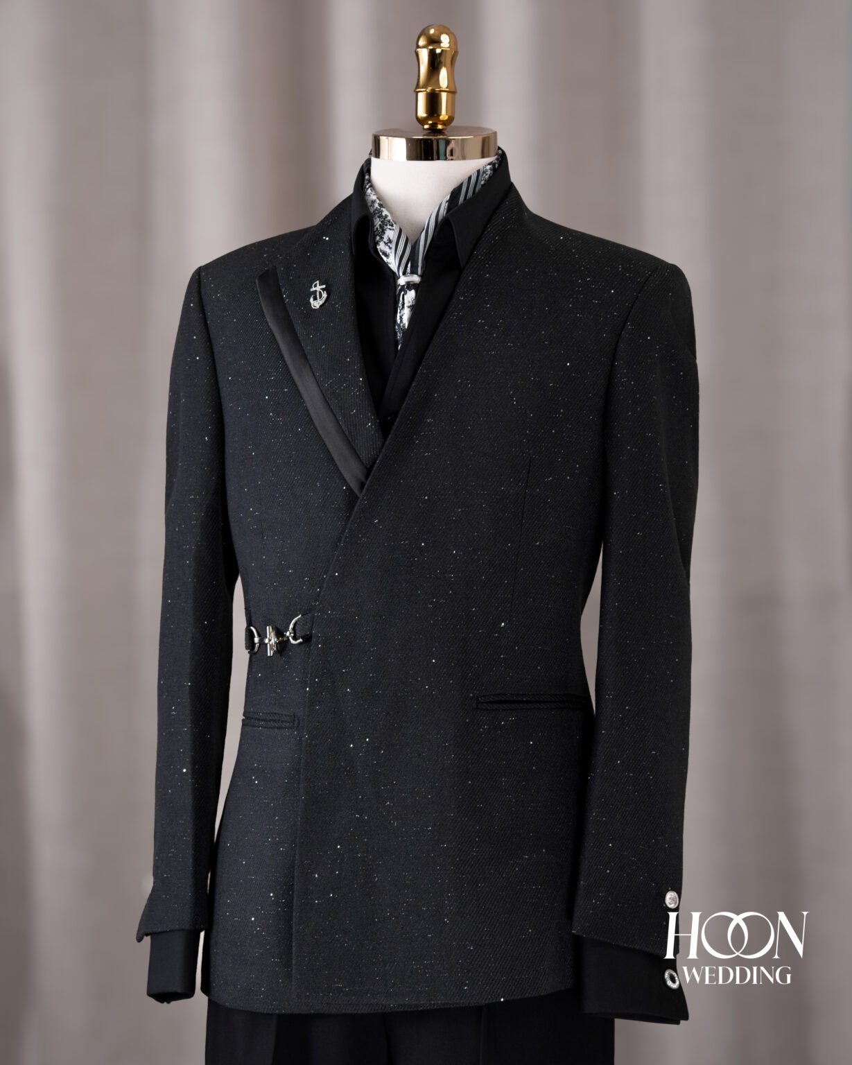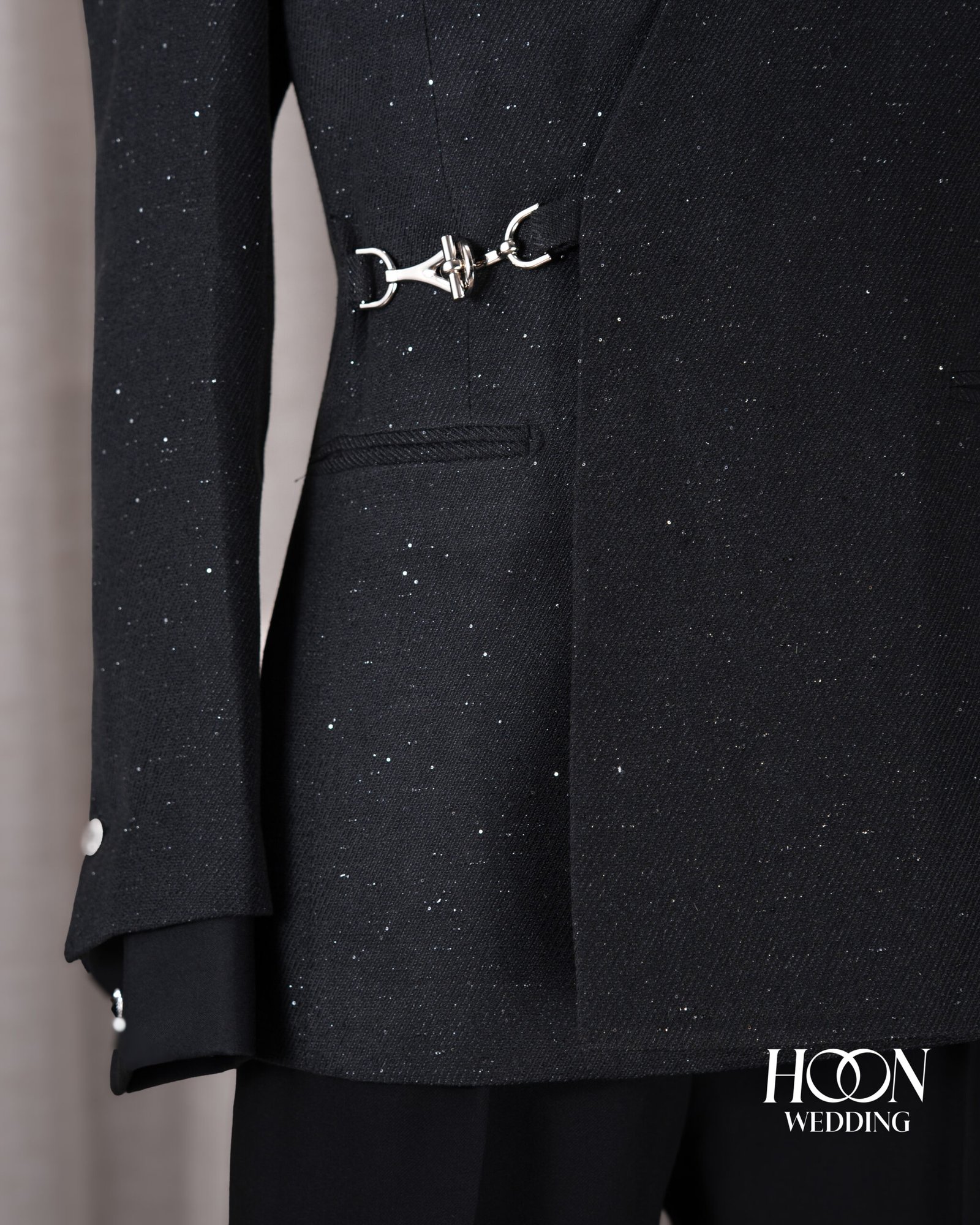 Suit đen bất đối xứng với hiệu ứng hạt sáng và khóa kim loại nổi bật, mang phong thái sang trọng – thời thượng chuẩn Signature.