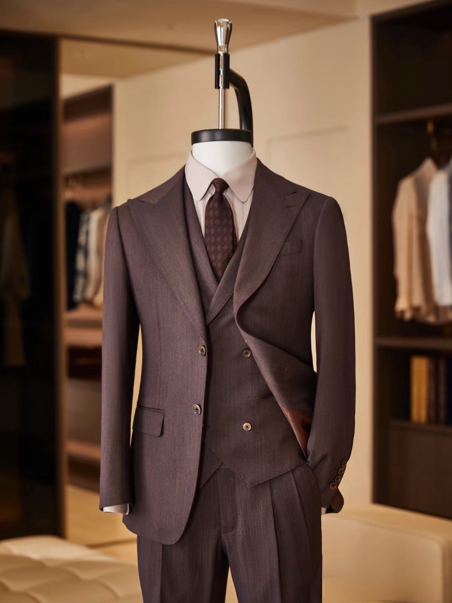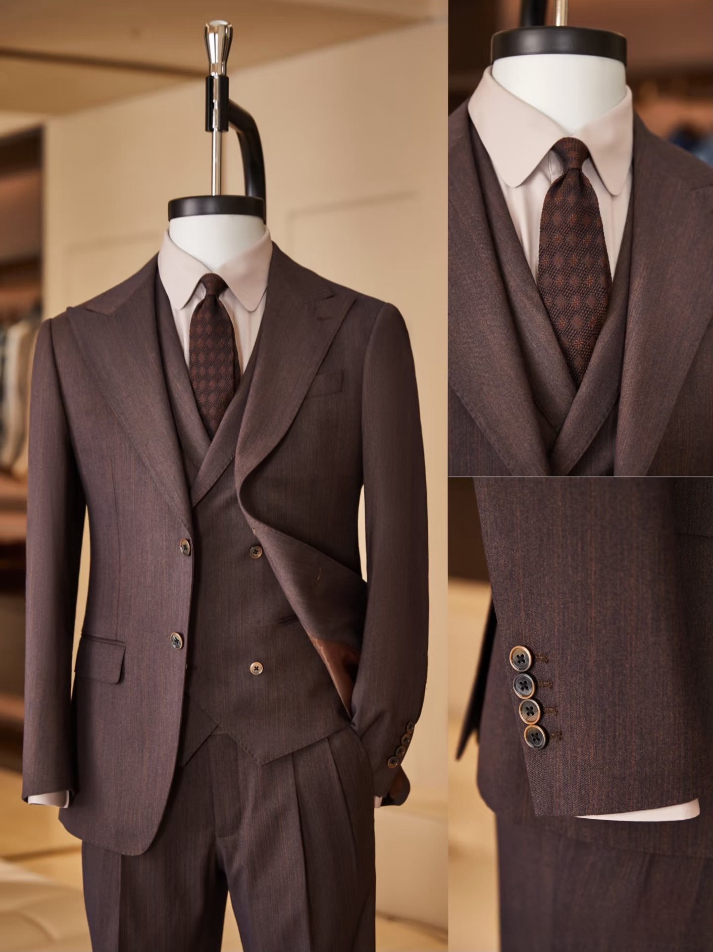 Modena Chestnut Wool Suit – Bộ suit nâu hạt dẻ đẳng cấp với thiết kế ba lớp, chất liệu wool cao cấp và đường may tinh tế, biểu tượng của phong cách quý ông Ý.