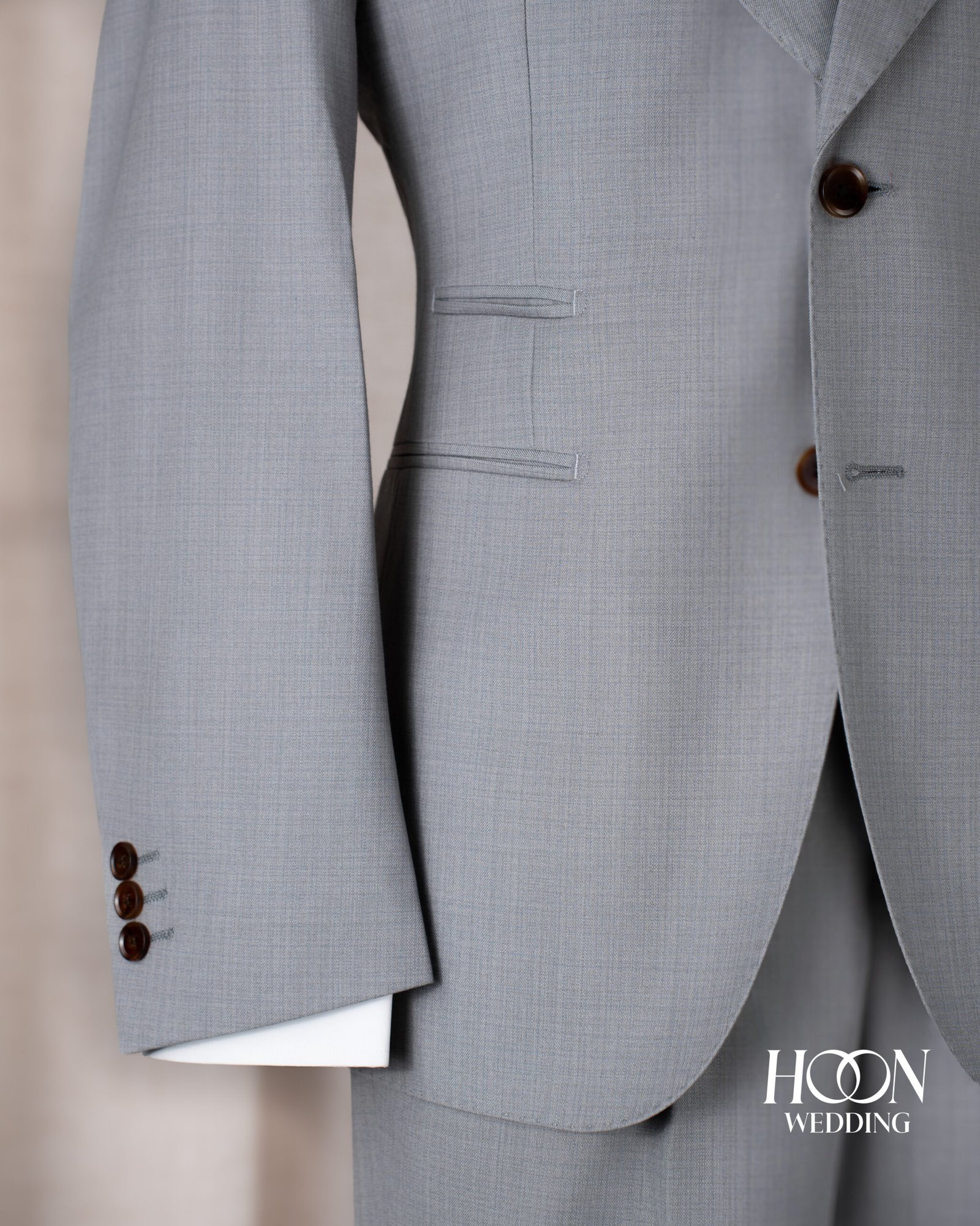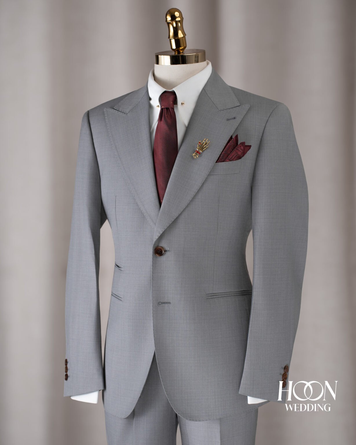 Signature Suit Modern Grey Epitome. Suit một hàng khuy tông xám trung tính hiện đại, ve áo Notch Lapel rộng, form dáng sắc nét. Lựa chọn hoàn hảo cho chú rể tinh tế.