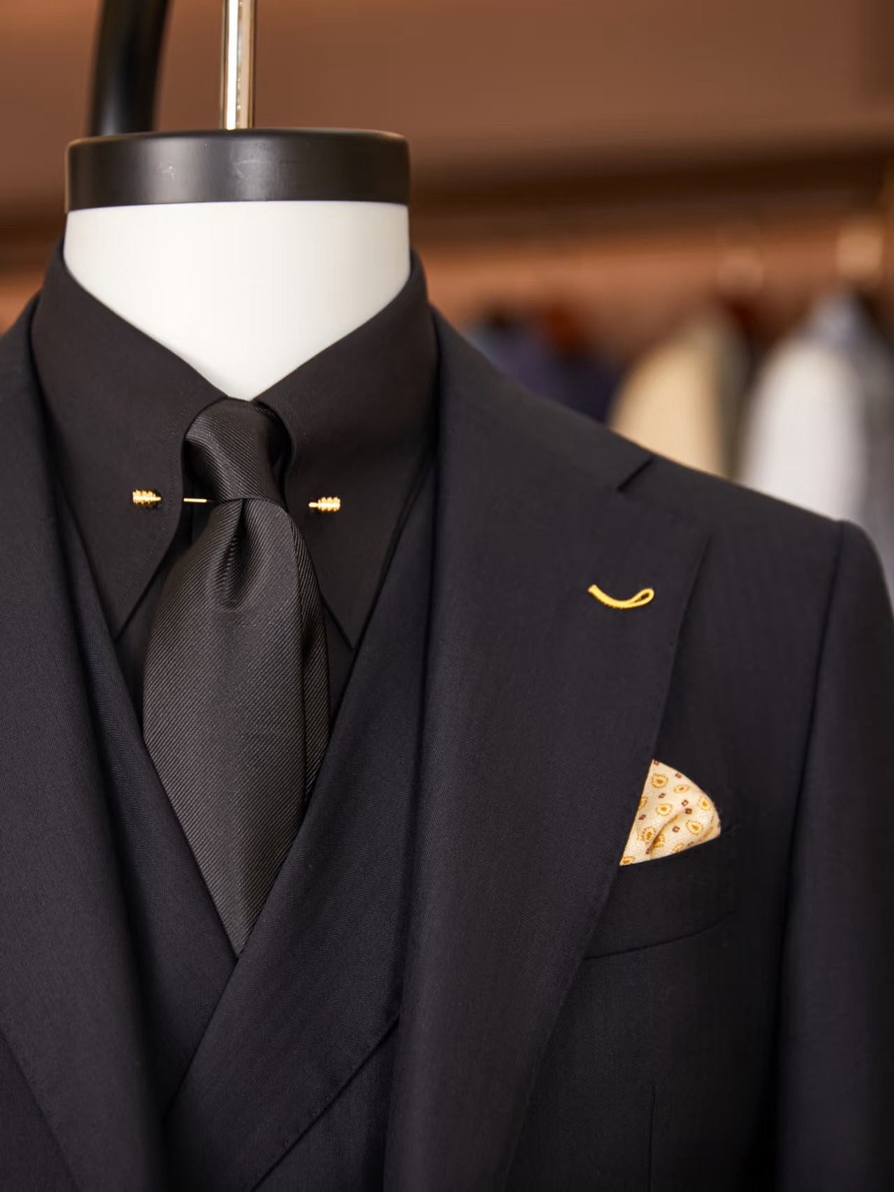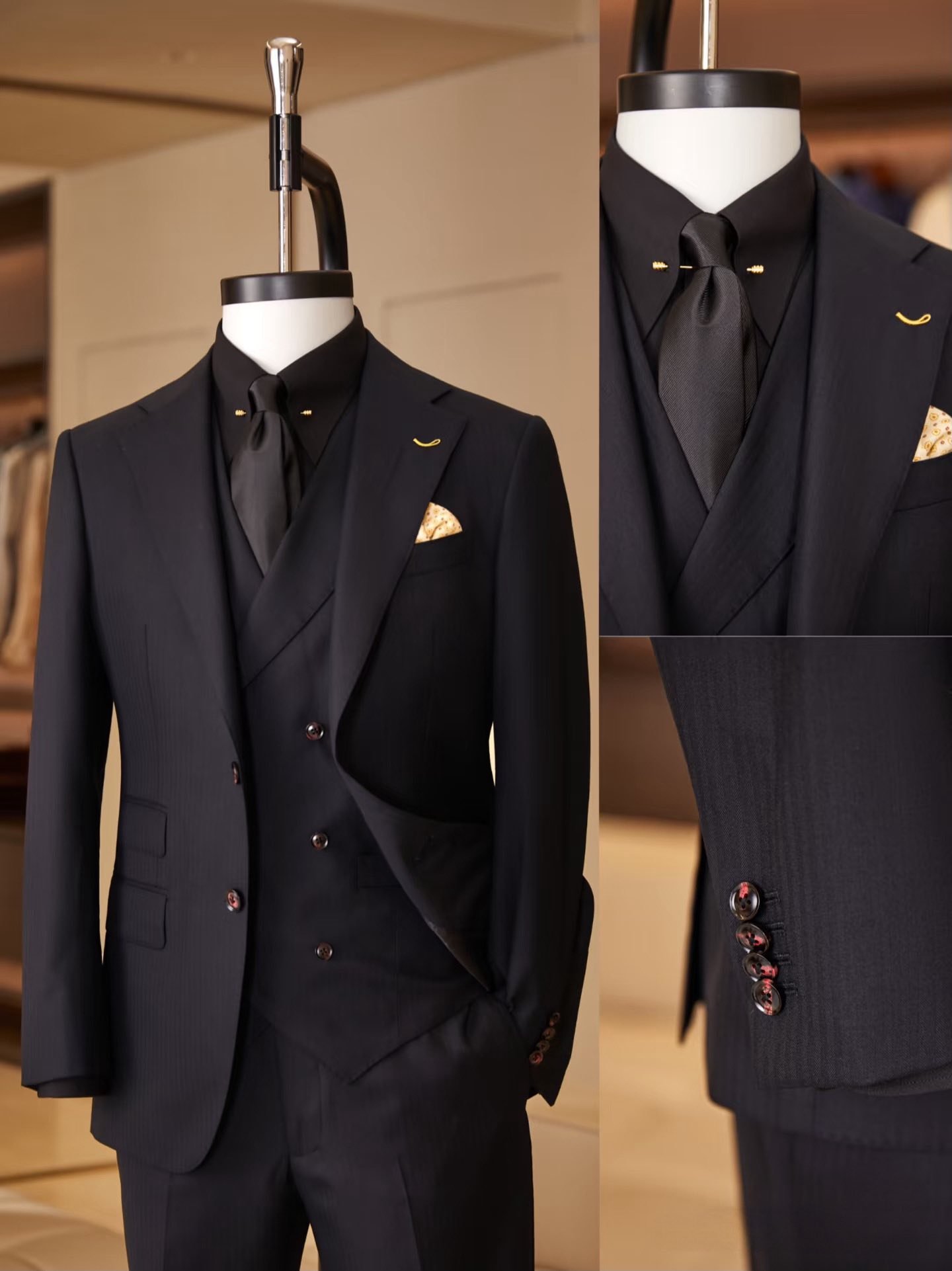 Napoli Midnight Double-Breasted Suit – Bộ suit đen huyền bí hai hàng khuy, kết hợp chi tiết kim vàng sang trọng, mang đậm phong cách quý ông Ý hiện đại.