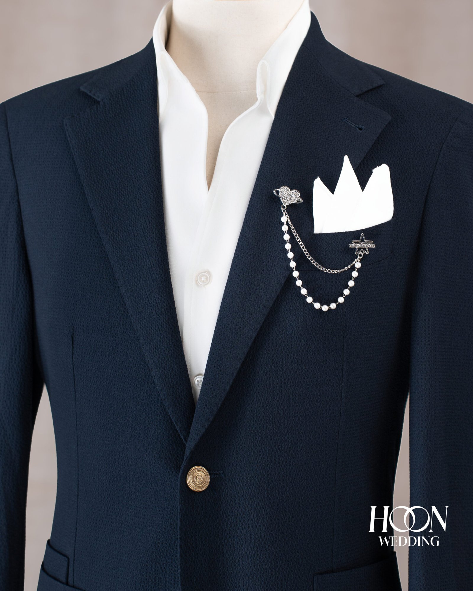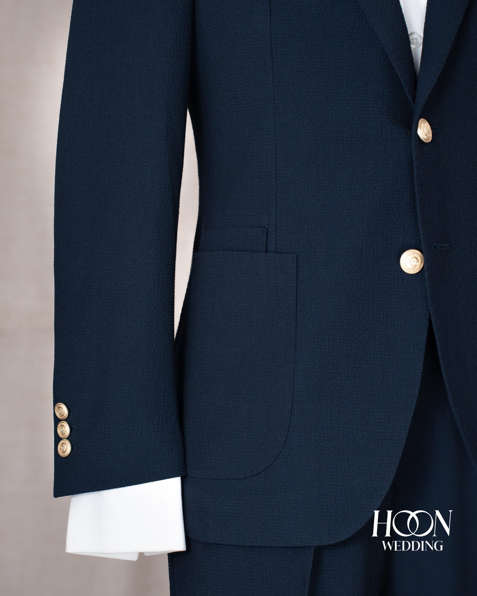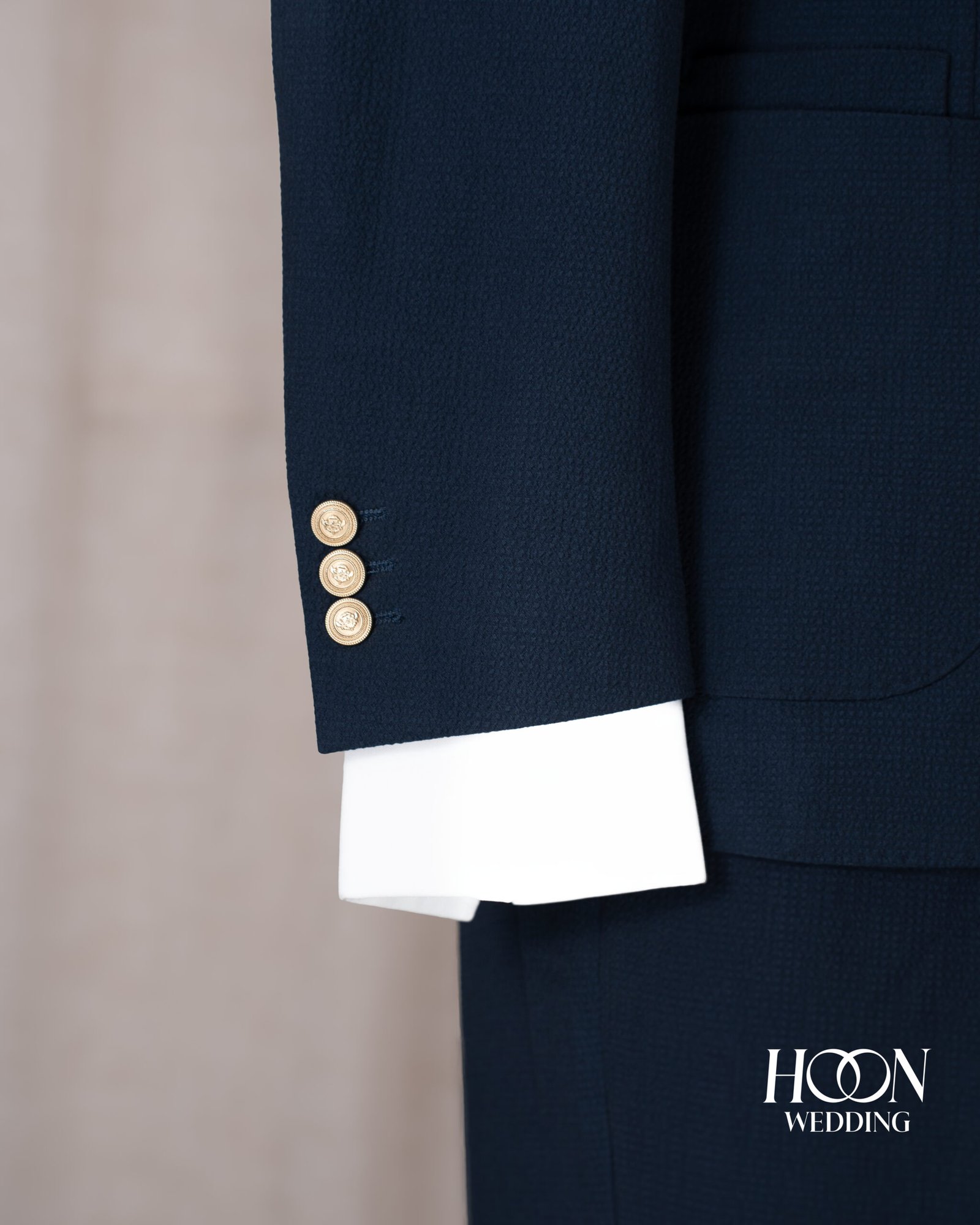 Signature Suit Navy Textured Commander. Suit Single-Breasted xanh navy đậm, vân dệt độc đáo, khuy vàng đồng. Phong cách hiện đại, mạnh mẽ, lịch lãm cho chú rể.