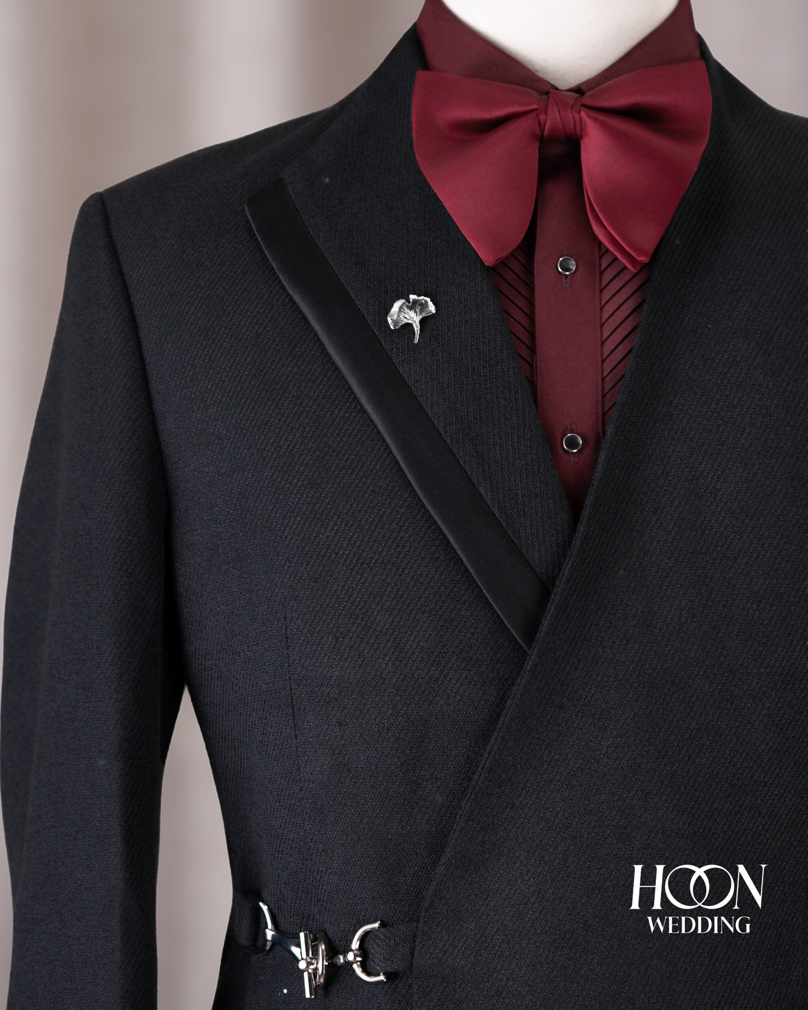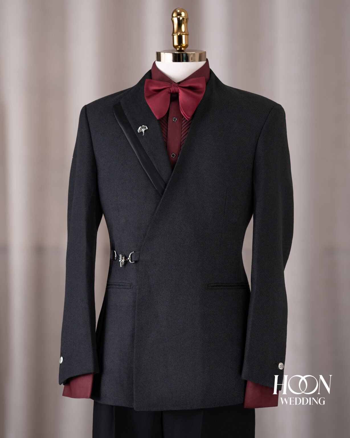 • Tông đen Obsidian sang trọng phối cùng sơ mi & nơ đỏ rượu nổi bật.
