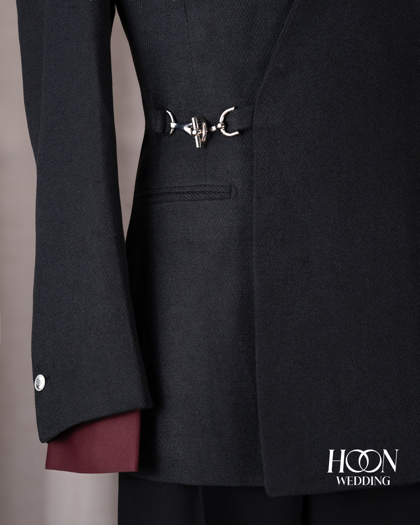 Suit đen lệch khuy với viền satin tinh xảo và khóa kim loại điểm nhấn – phong thái Elegant mạnh mẽ và khác biệt.