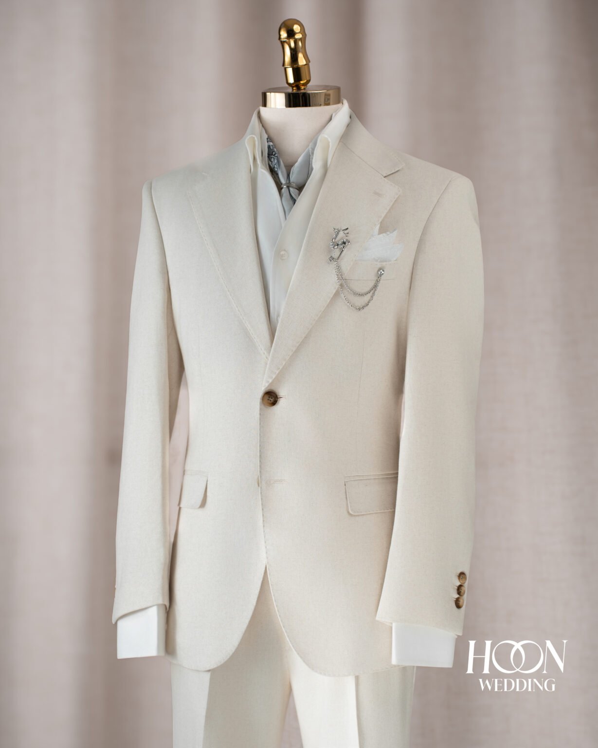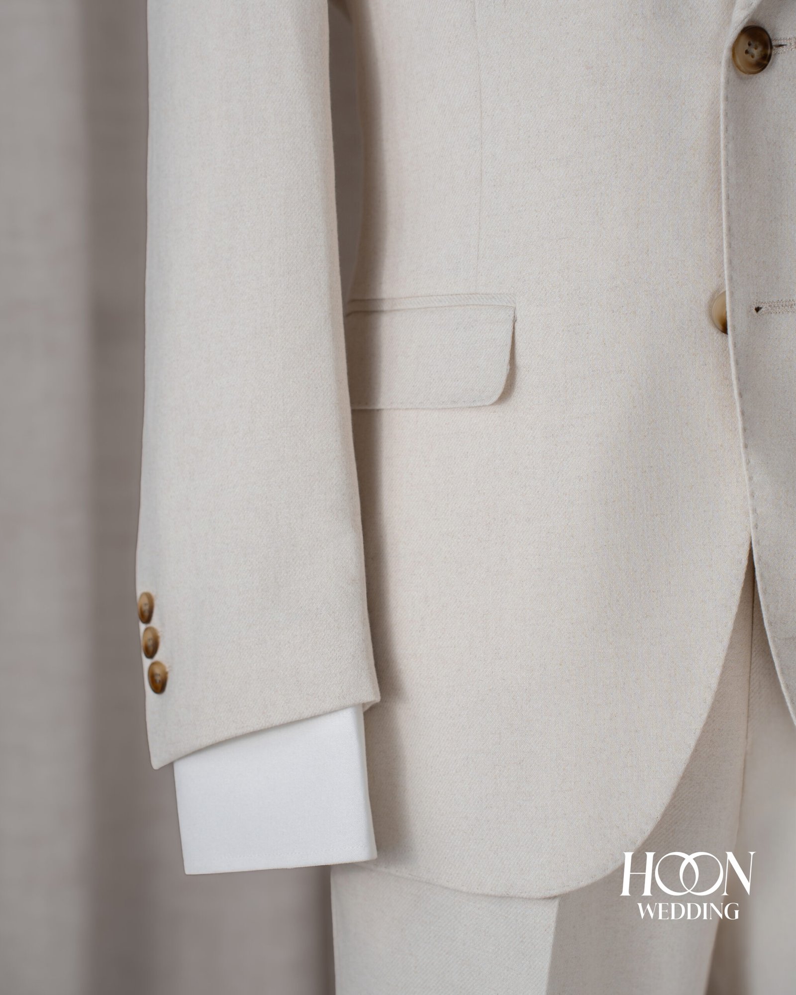 Signature Suit Riviera Cream Linen Blend. Suit một hàng khuy màu trắng kem, chất liệu Linen Blend thoáng mát. Phong cách thanh lịch, phóng khoáng, hoàn hảo cho tiệc cưới ngoài trời lãng mạn.