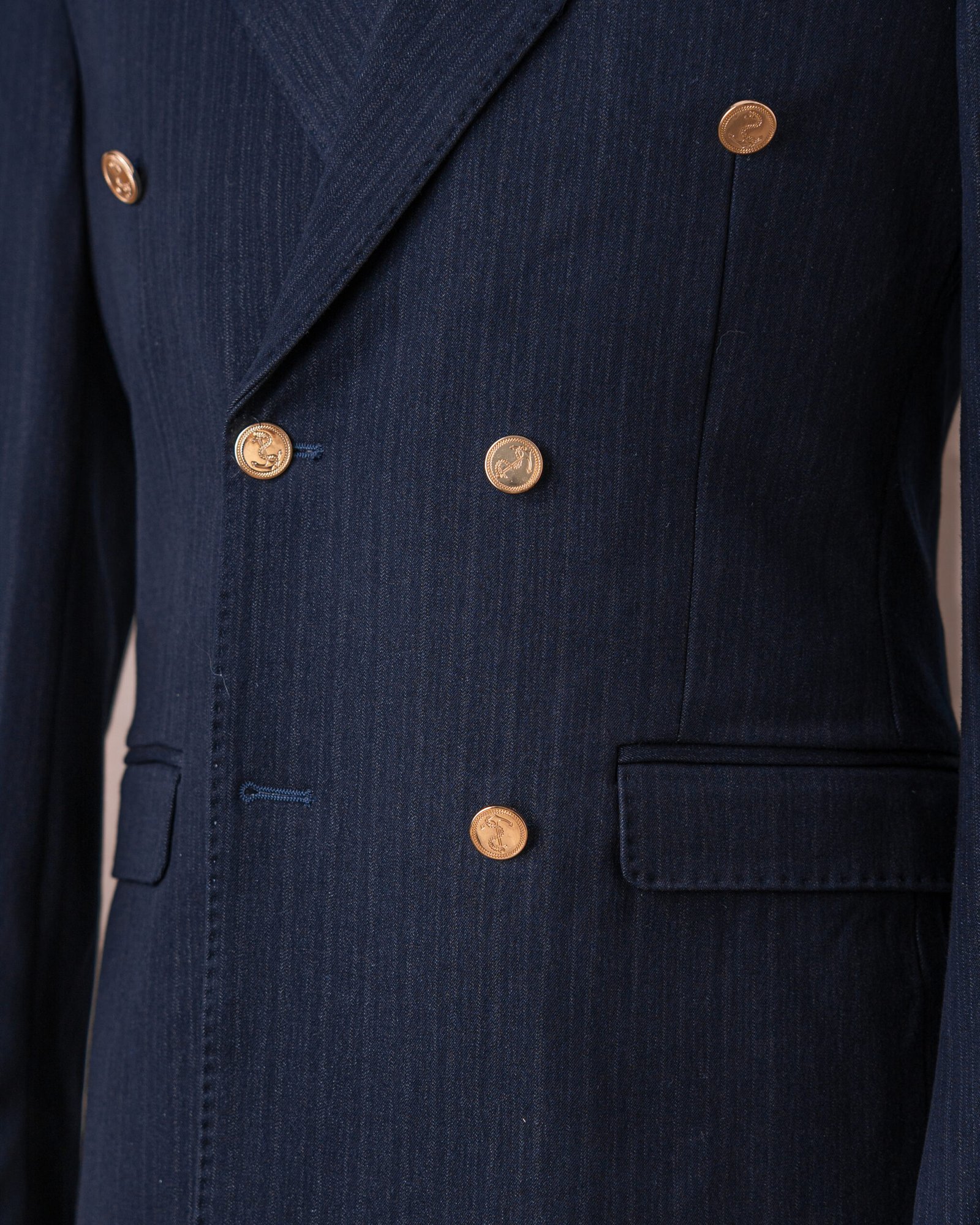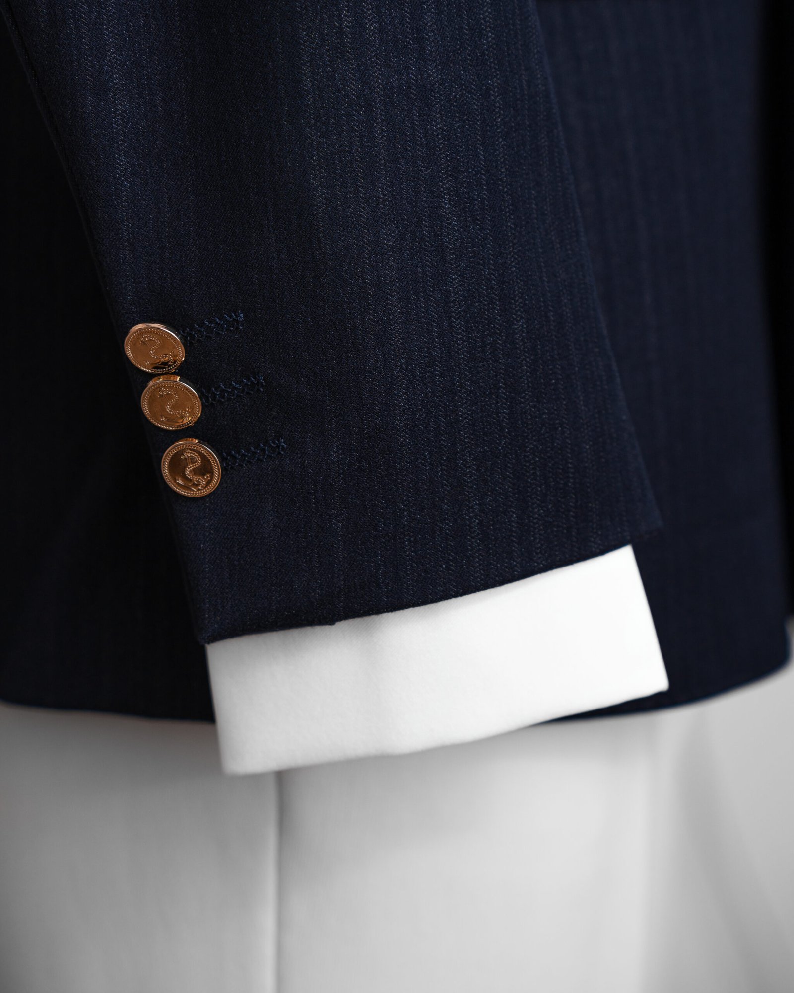 Royal Pinstripe Navy Suit – lựa chọn đẳng cấp cho chú rể tại TP.HCM. Bộ suit mang phong cách double-breasted với hàng khuy kim loại mạ vàng sang trọng, tôn lên vẻ lịch lãm và quyền quý. Vải navy đậm phối sọc ẩn kết hợp tinh tế giữa cổ điển và hiện đại, lý tưởng cho những buổi tiệc cưới sang trọng.
