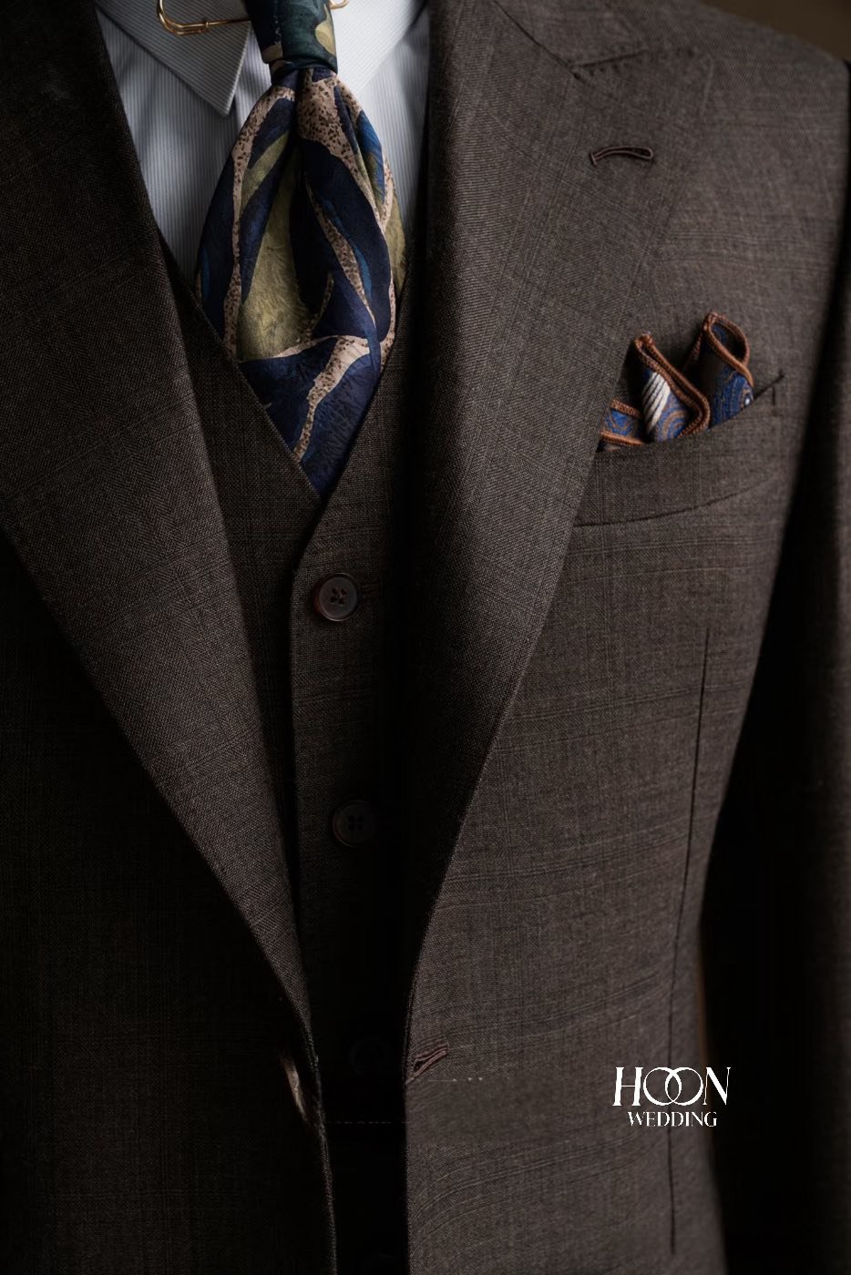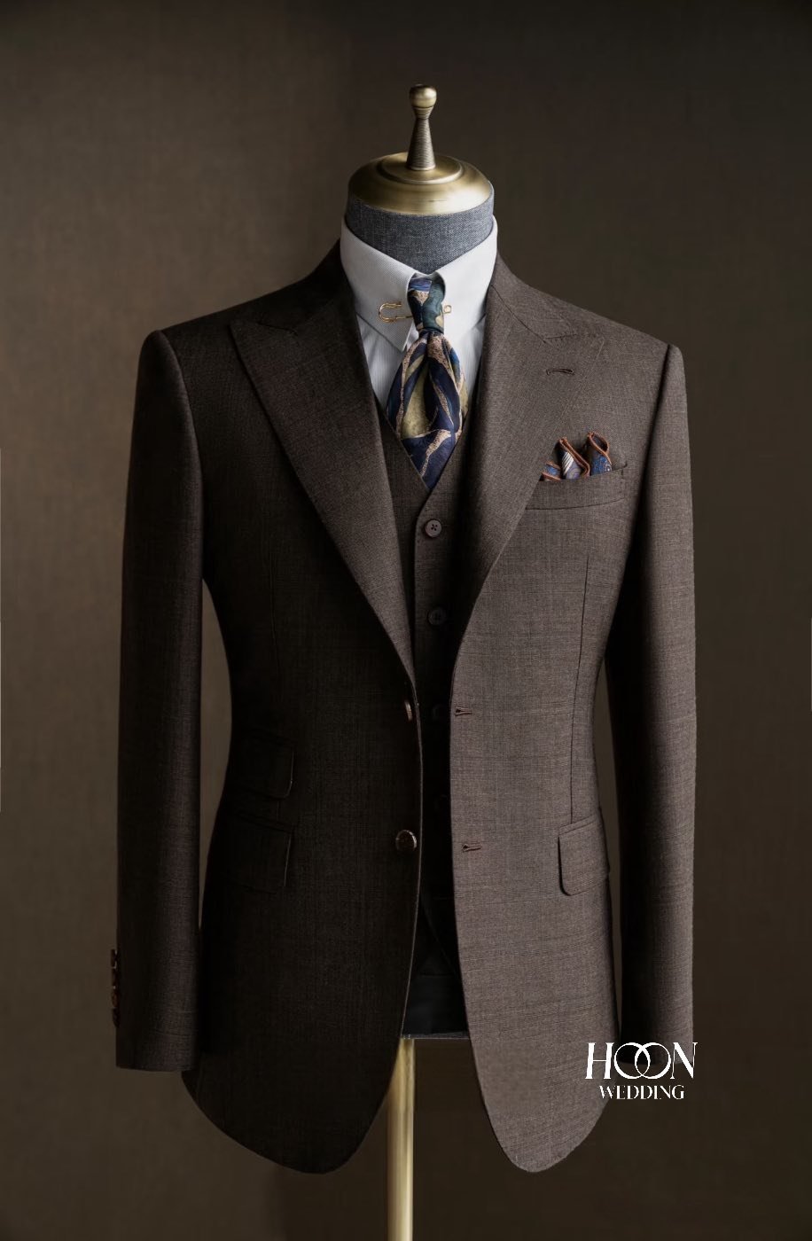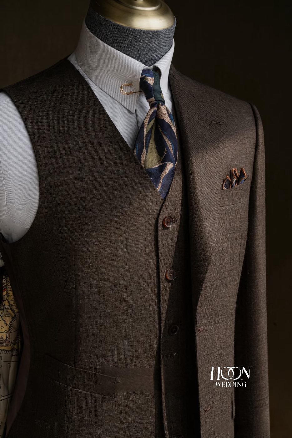 Siena Brown Three-Piece Suit – Bộ suit nâu cao cấp với thiết kế ba lớp thanh lịch, chất liệu wool mềm mịn và đường may Bespoke tinh tế, dành cho quý ông đẳng cấp.