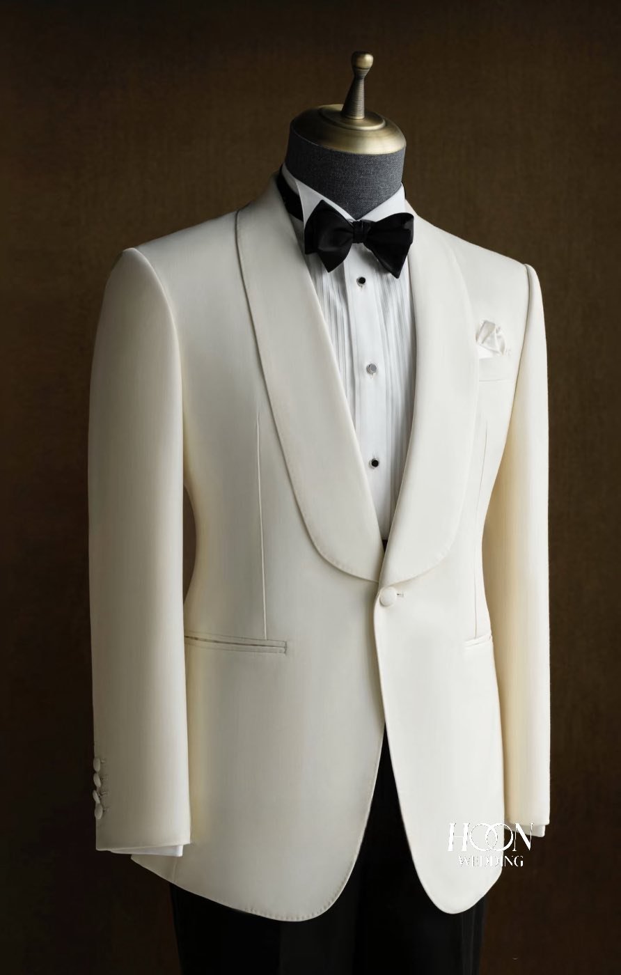 The Milan Ivory Tuxedo – tuxedo trắng ngà sang trọng với ve shawl satin, chất liệu wool-silk cao cấp. Thiết kế thanh lịch, hoàn hảo cho lễ cưới và sự kiện cao cấp.