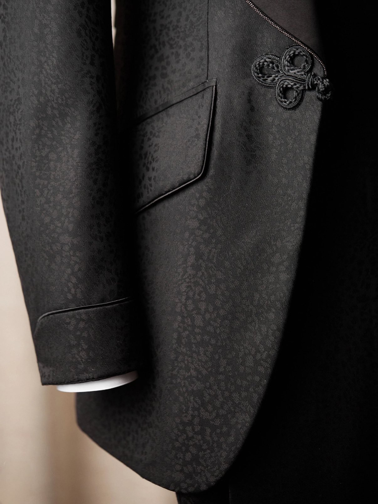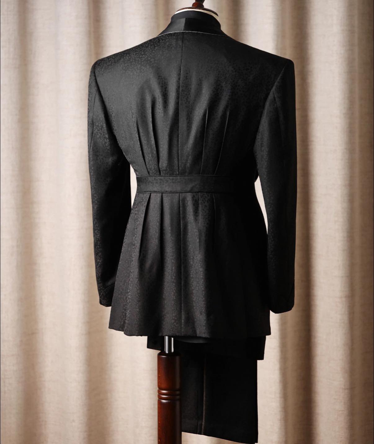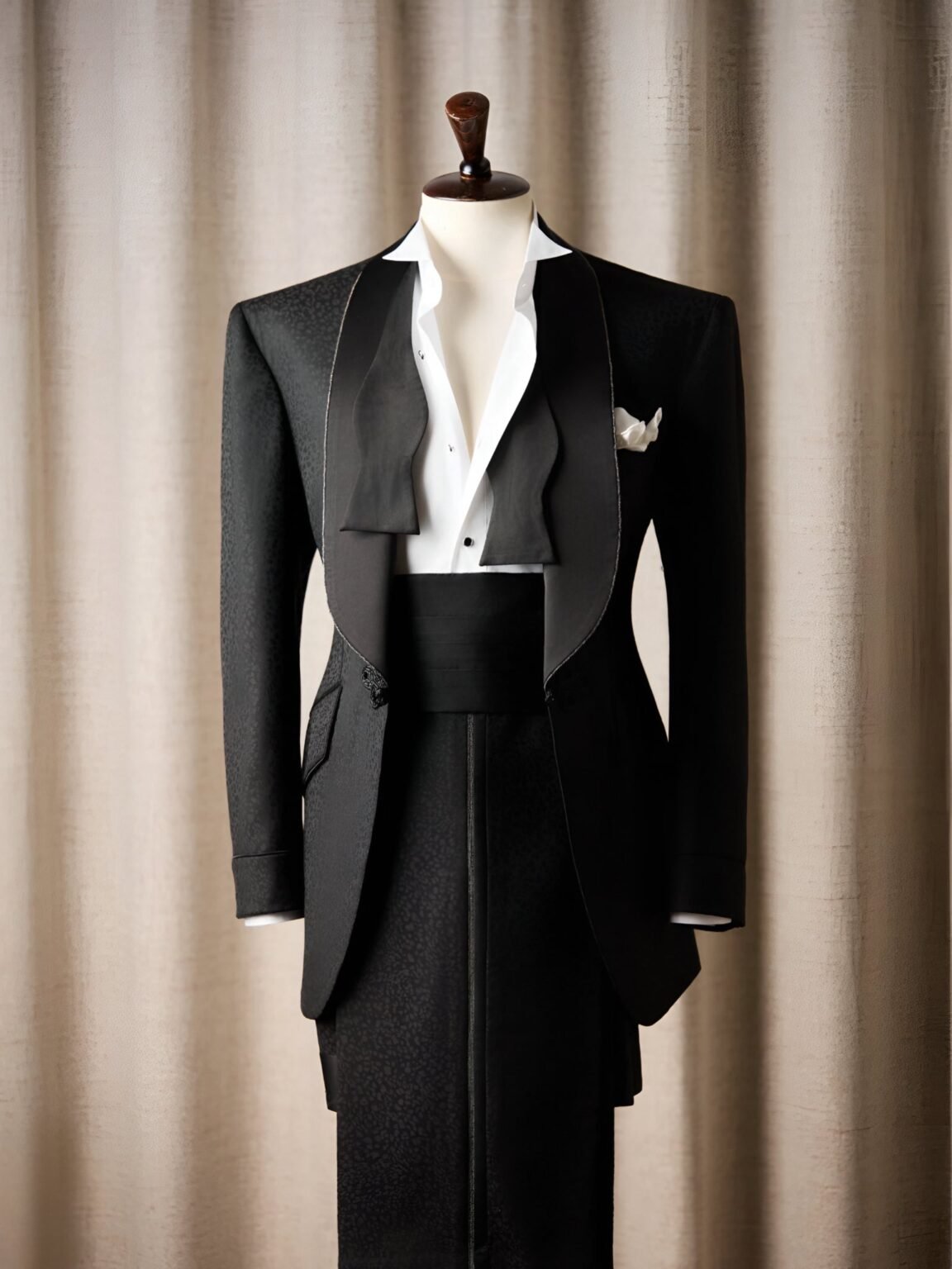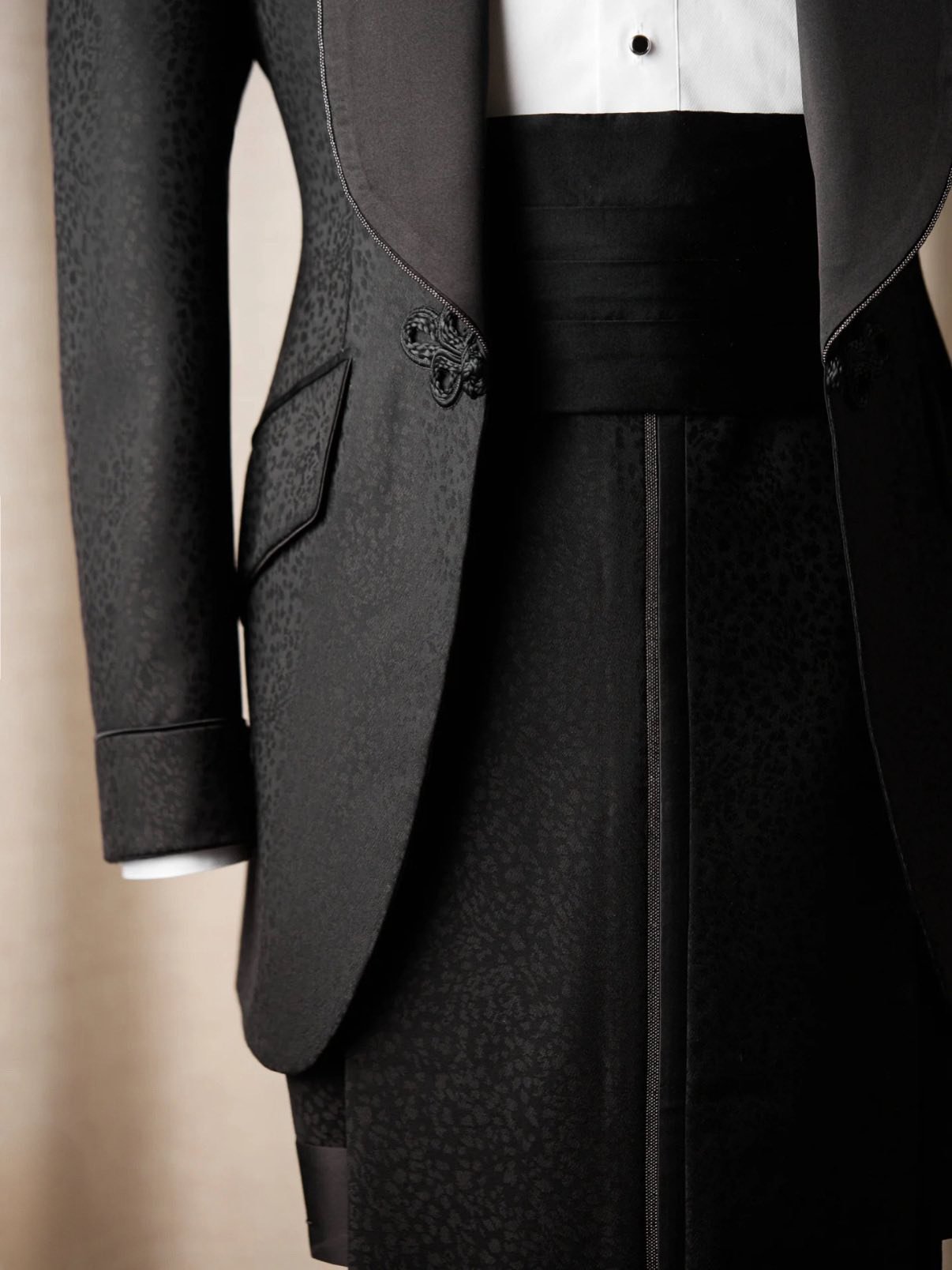 The Noir Bespoke Tuxedo – bộ tuxedo đen cao cấp với ve satin bóng, chất liệu jacquard tinh xảo, mang đến phong thái sang trọng và đẳng cấp cho quý ông trong mọi sự kiện.