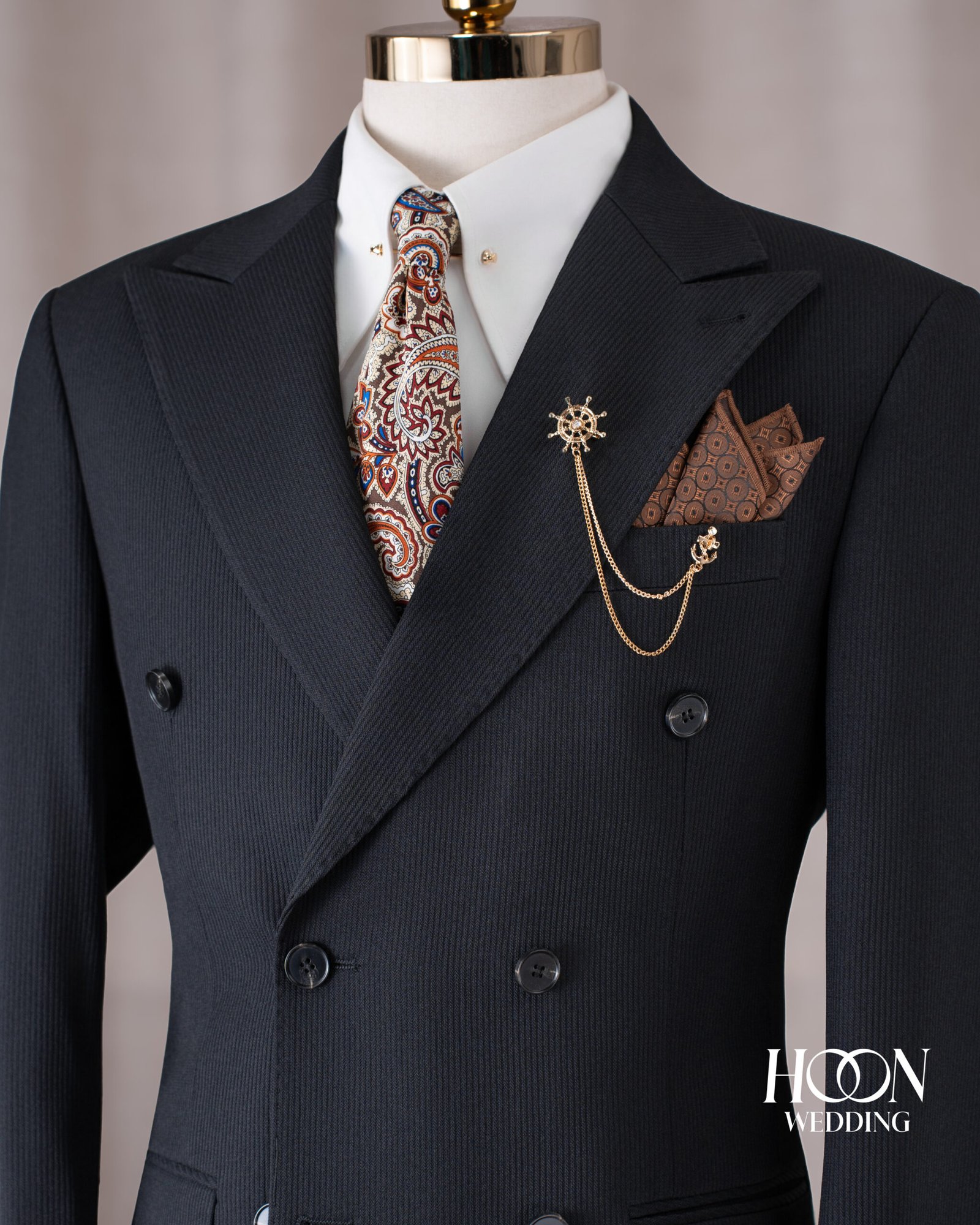 Phụ Kiện Nổi Bật: Ghim cài áo mạ vàng (lapel pin) kết hợp dây xích, tạo sự tương phản thu hút.