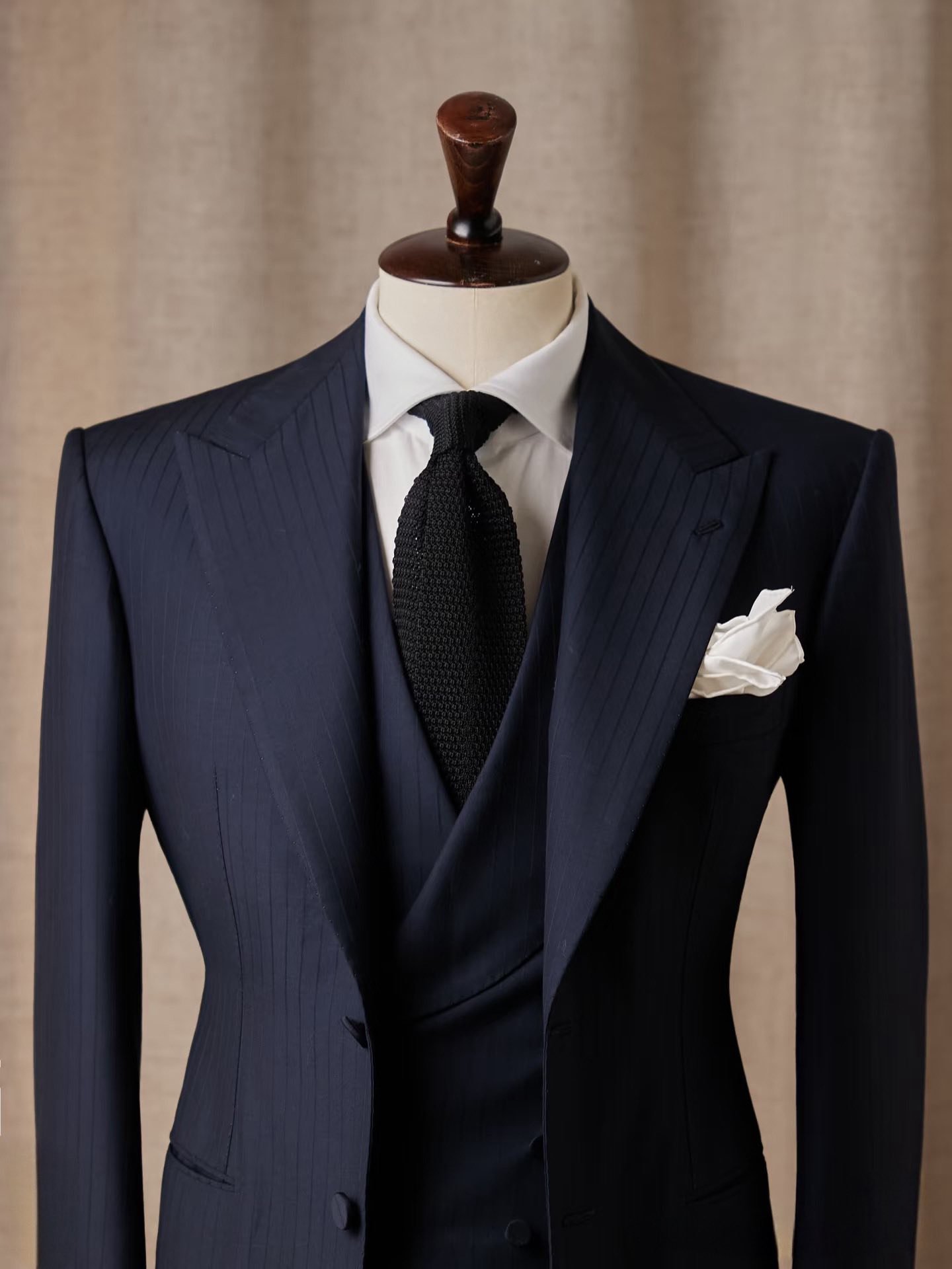 The Windsor Bespoke Suit – bộ suit xanh navy 3 mảnh với ve nhọn bản lớn, sọc chìm tinh tế. Chất liệu wool Ý cao cấp, tôn dáng và thể hiện đẳng cấp quý ông Anh quốc.