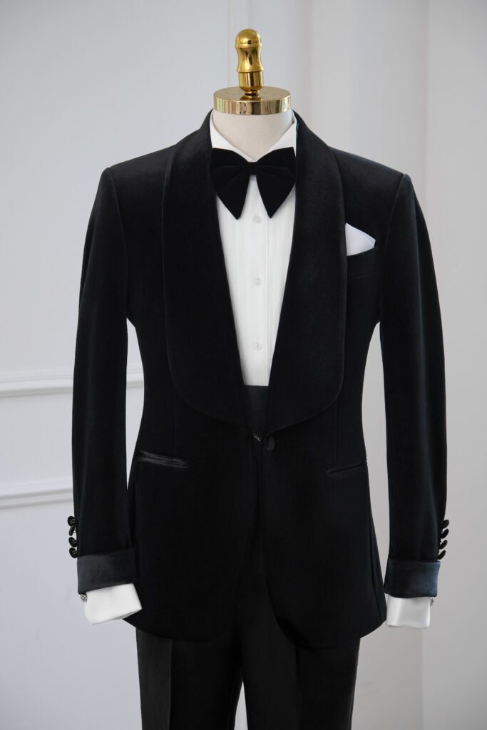1. Tuxedo đen ve satin – Biểu tượng cổ điển của sự thanh lịch