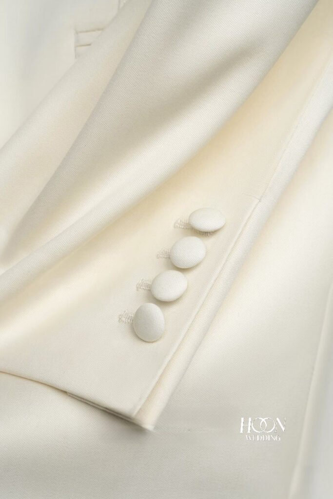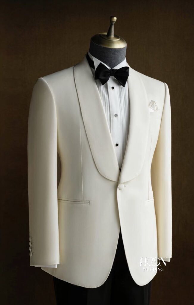 • Tuxedo trắng cổ shawl – thanh lịch, hiện đại cho lễ cưới ban ngày.